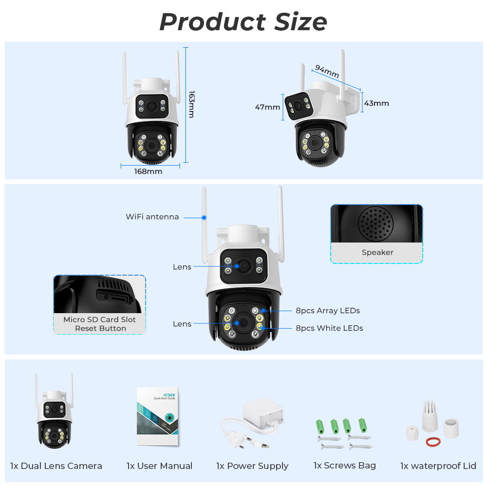 -Двойной объектив с двумя датчиками, двойной экран, широкоугольный обзор + Просмотр на большом расстоянии для достижения четкого мониторинга издалека и вблизи;
