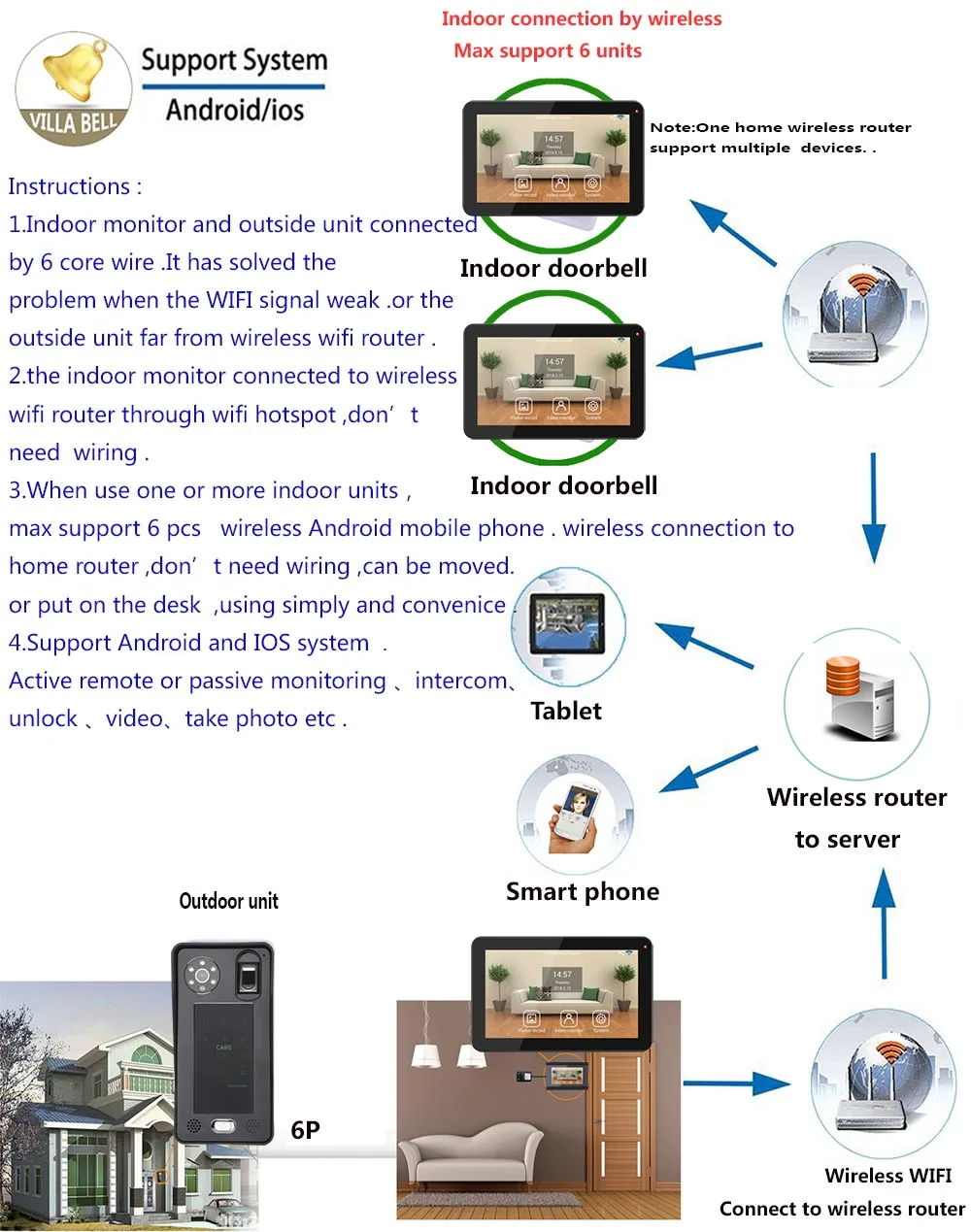 Простая установка самостоятельно с помощью адаптера и кабеля, которые мы предоставили в этом комплекте, наружный блок может подключаться к внутреннему монитору с помощью проводного Кабеля 6P. Когда внутренний монитор подключен к вашему беспроводному Wi-Fi-маршрутизатору, вы можете подключить мобильный телефон к внутреннему монитору, затем мобильный телефон также может записывать видео или открывать дверь и т. Д. Широко использованный в виллах, квартирах, домах, гостиницах, Офисы, общественные здания и так далее.