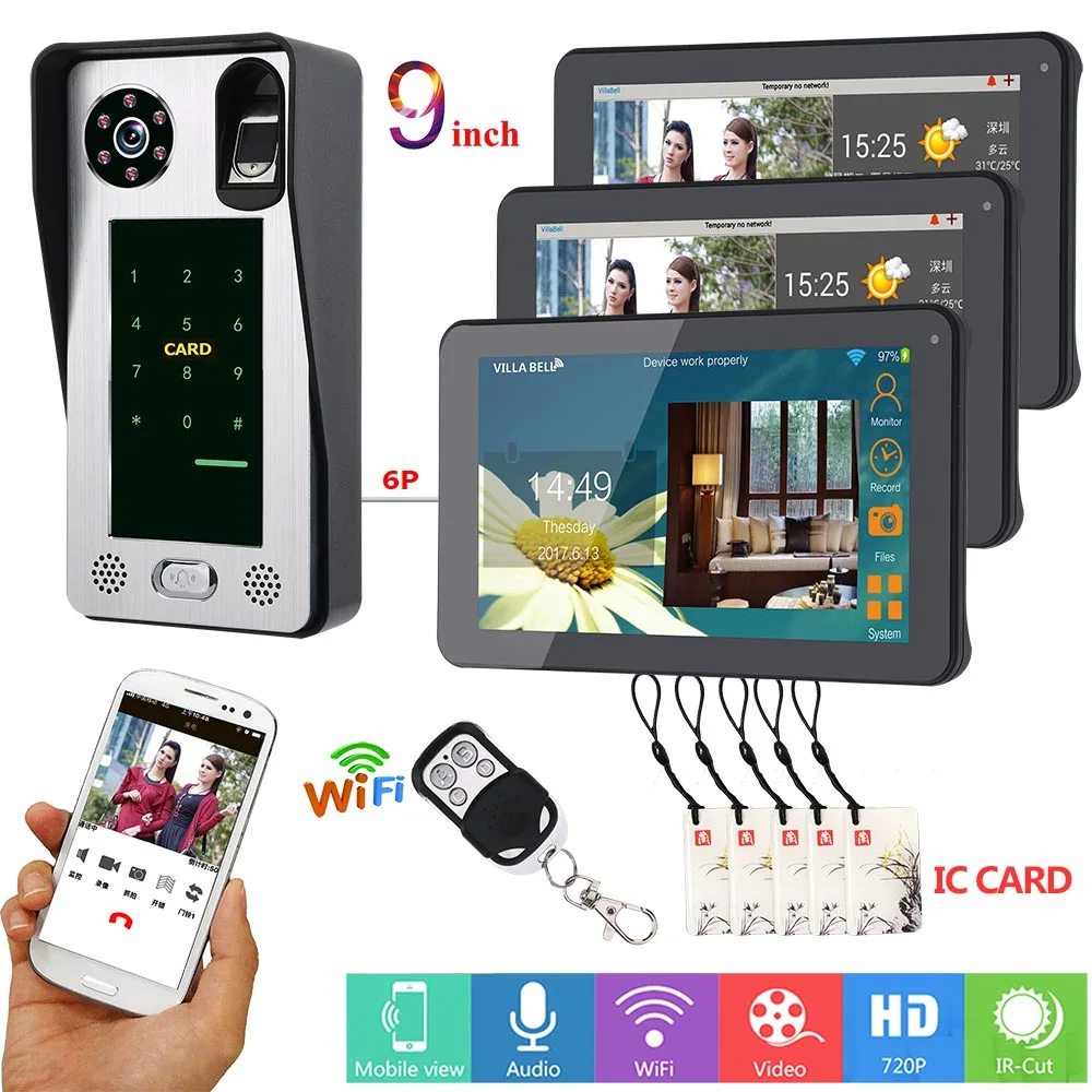 1/2/3 мониторы 9-дюймовый проводной Wi-Fi карта отпечатков пальцев IC видеодомофон дверной звонок Домофон с системой контроля доступа к двери, поддержка удаленной разблокировки приложения, запись, снимок