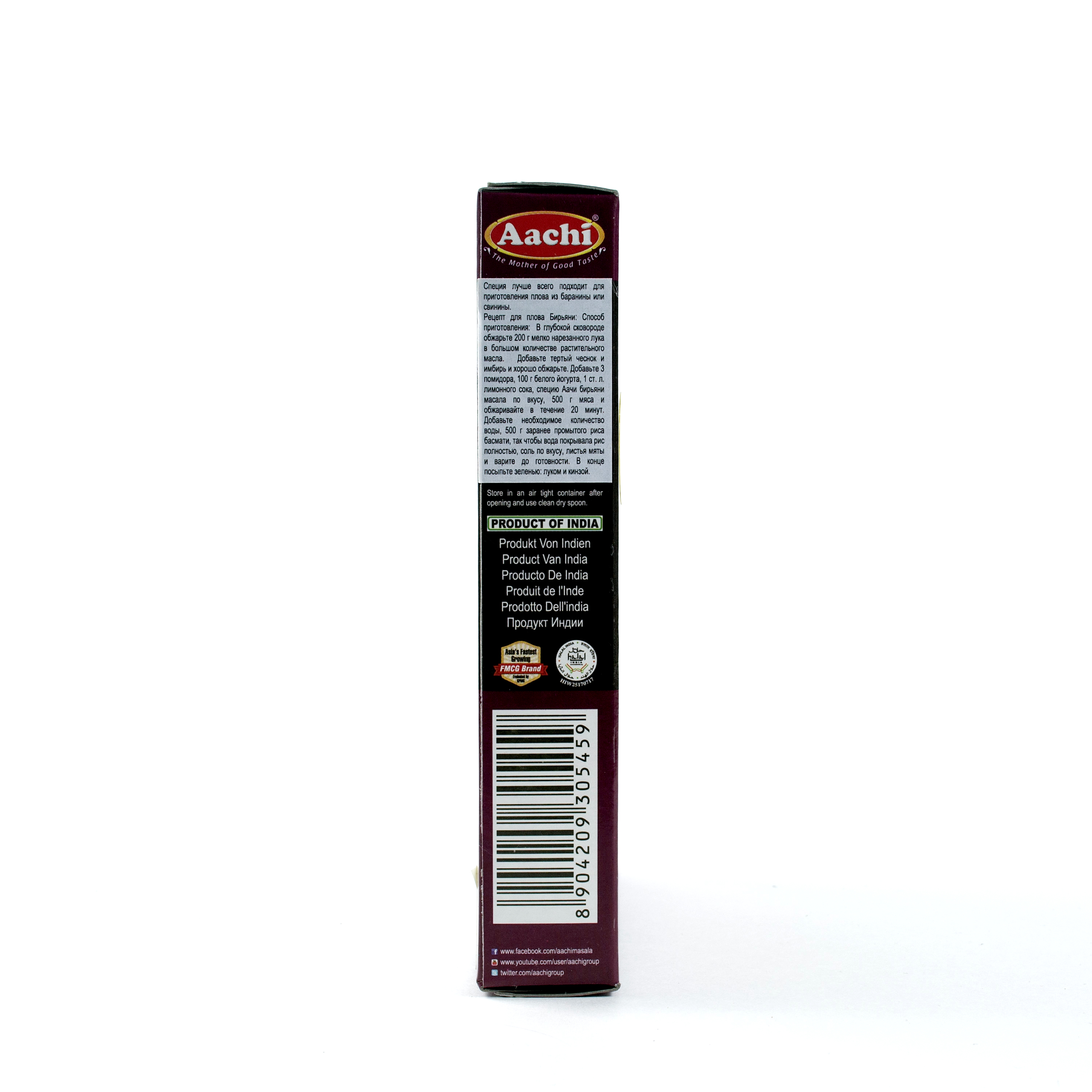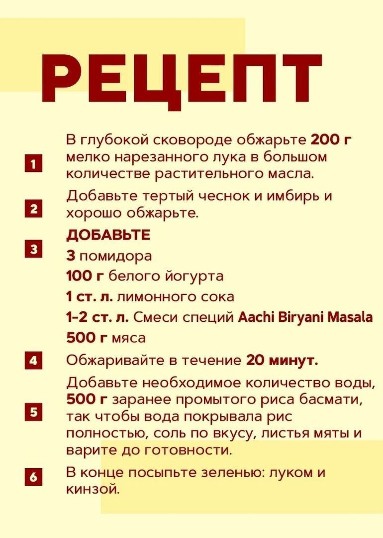Бирьяни масала от "Aachi" состоит из 11 пряностей и специй. Лучше всего смесь специй подходит для приготовления плова из баранины, свинины, а также для вегетарианского плова.