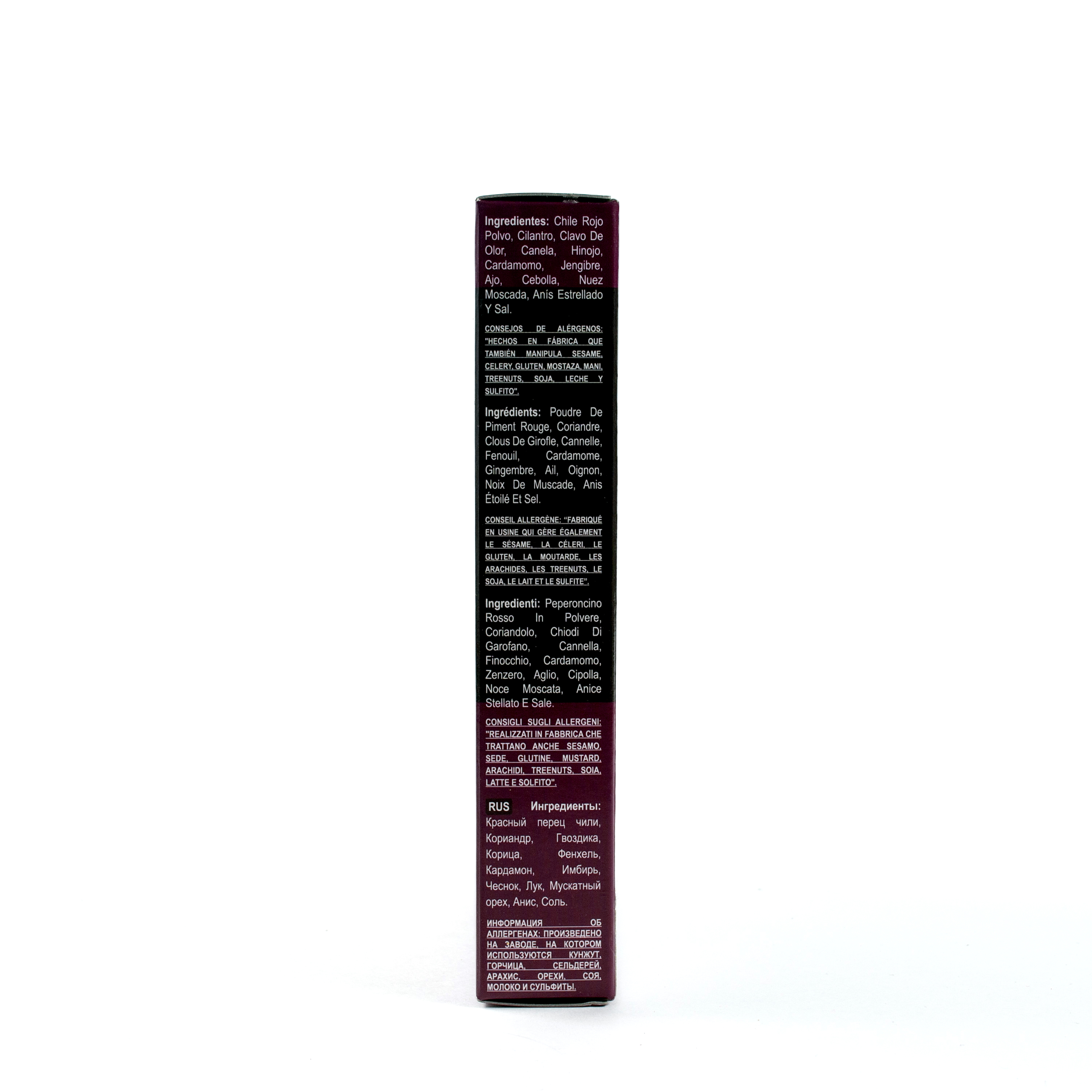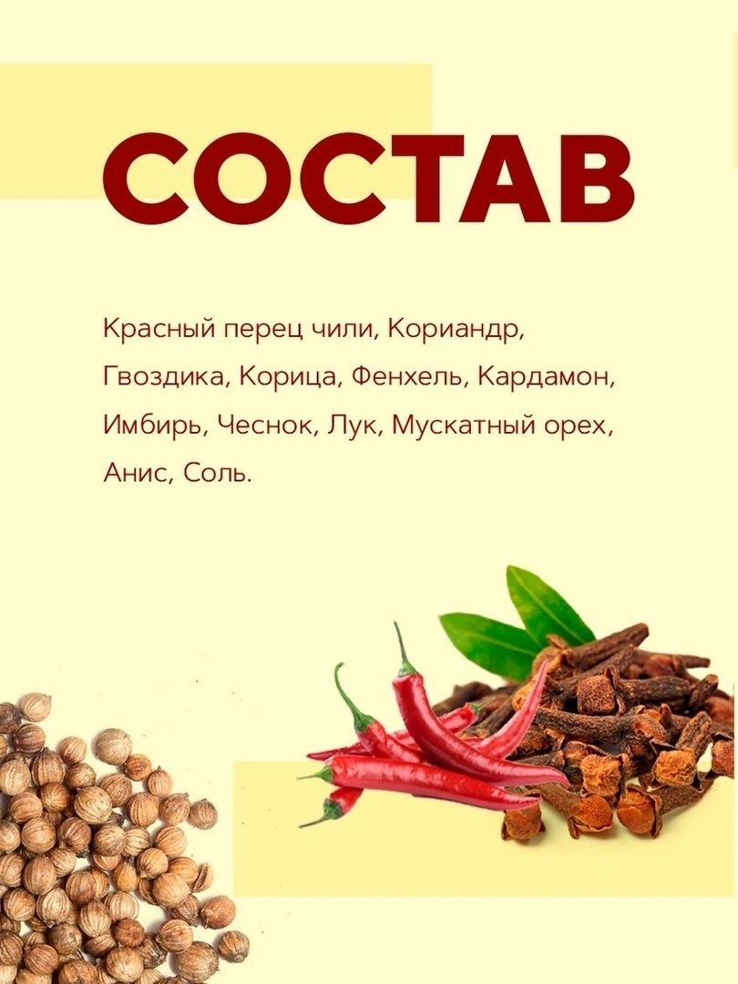 Красный перец чили, Кориандр, Гвоздика, Корица, Фенхель, Кардамон, Имбирь, Чеснок, Лук, Мускатный орех, Анис, Соль.