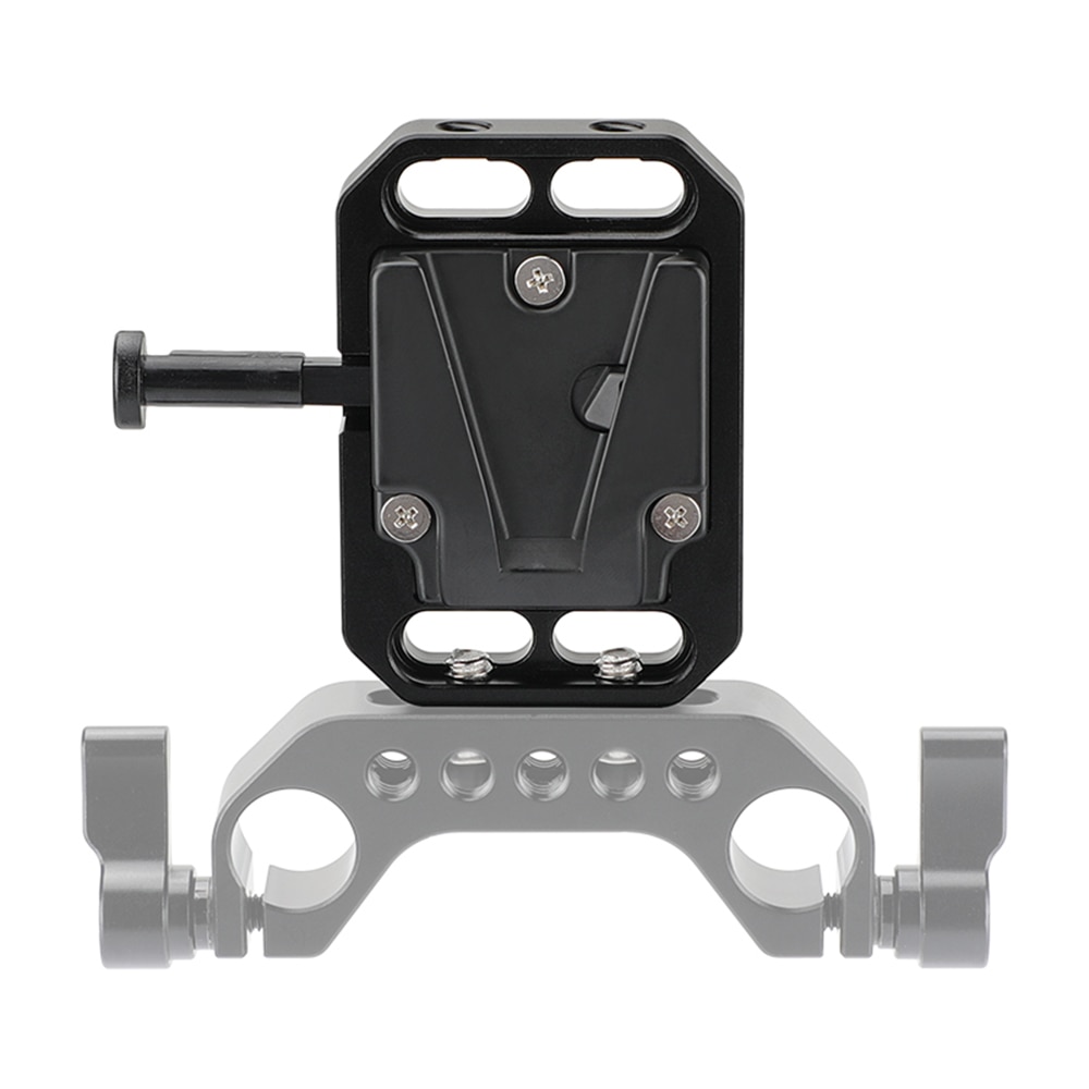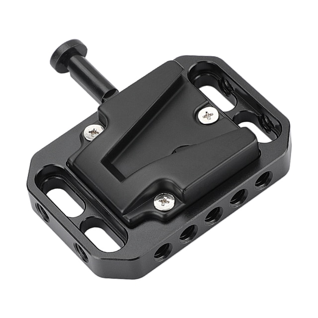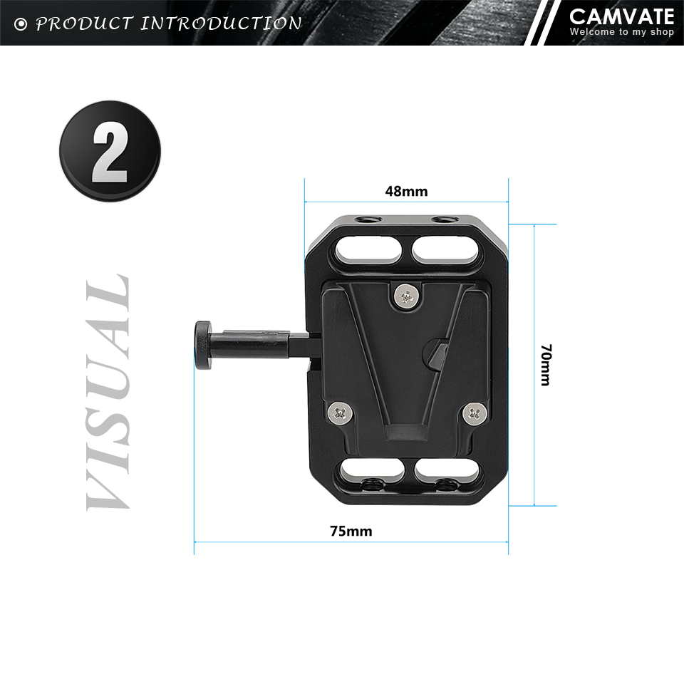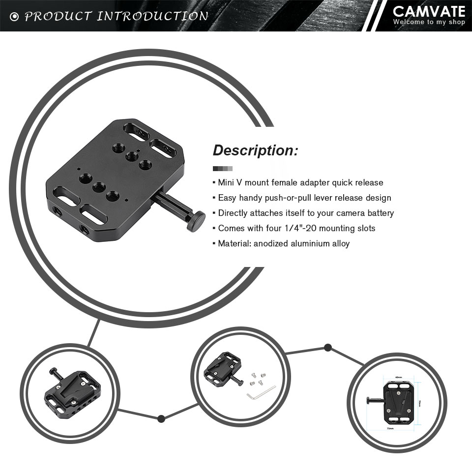 • Женский адаптер Mini V Mount предназначен для непосредственного размещения батареи с V-образным замком, он имеет быстросъемную конструкцию разблокировки рычага нажатия или тяги, которая позволяет быстро прикрепить или отсоединить аккумулятор камеры, И предохранительная защелка для предотвращения неожиданного отсоединения.