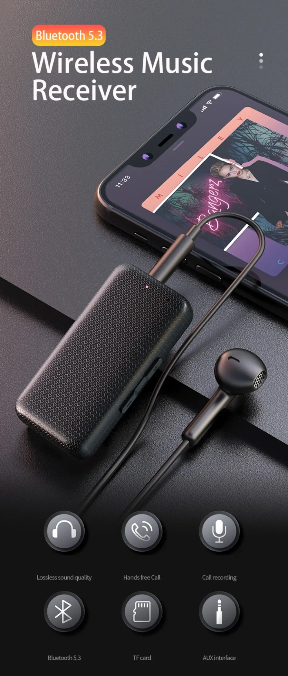 Адаптер для автомобильного приемника Bluetooth 5,3, разъем AUX 3,5 мм, музыкальный ресивер без потерь, громкая связь, запись звонков, поддержка TF карты