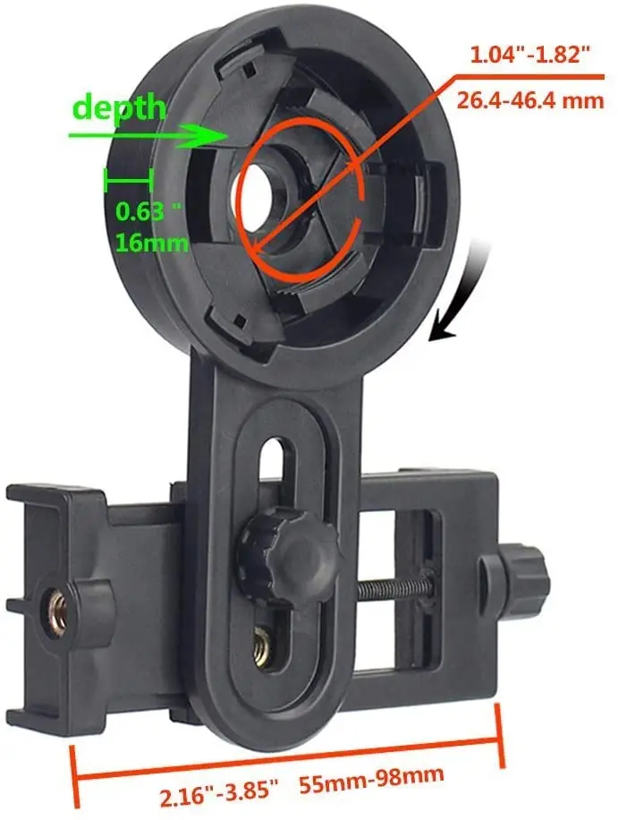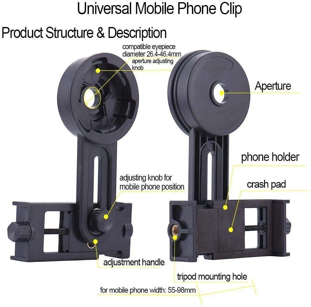 Это универсальный инструмент для телефона камеры, изготовленный из жесткого пластика, мягкого губчатого материала, не повреждает ваш мобильный телефон, фиксируя его в адаптере. Микроскоп, телескоп, бинокулярный, монокуляр, Диапазон ночного обнаружения, регулировка диаметра ресниц 26,4 мм-46,4 мм. Подходит для ширины смартфона 54,6-97,9 мм. Не совместим с DSLR камерами.