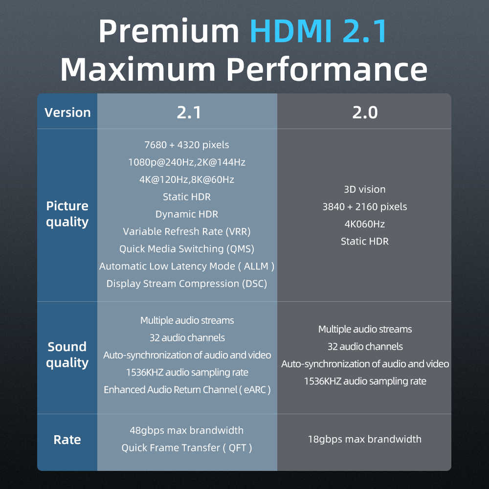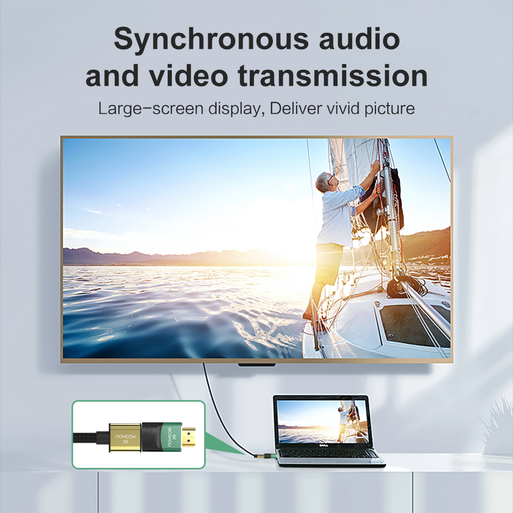 Кабель MOSHOU 8K HDMI 2,1 с поддержкой 8K при 60 Гц, 4K при 120 Гц/60 Гц, 2K 144 Гц, подходит для всех устройств со стандартом HDMI 2,1, обратная совместимость с предыдущими HDMI 2,0, 1,4, 1,3, 1,2 и 1,1. Благодаря пропускной способности 48 Гбит/с для новейших функций Наслаждайтесь непревзойденным ощущением сверхвысокой четкости на большом экране.