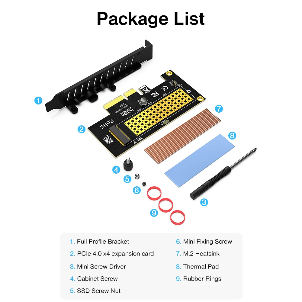 Посылка включает в себя: 1 * адаптер, 1 * Профиль, 1 * Винт для шкафа, 1 * SSD винт, 1 * отвертка, 1 * радиатор, 1 * Тепловой коврик, 3 * Резиновые Кольца