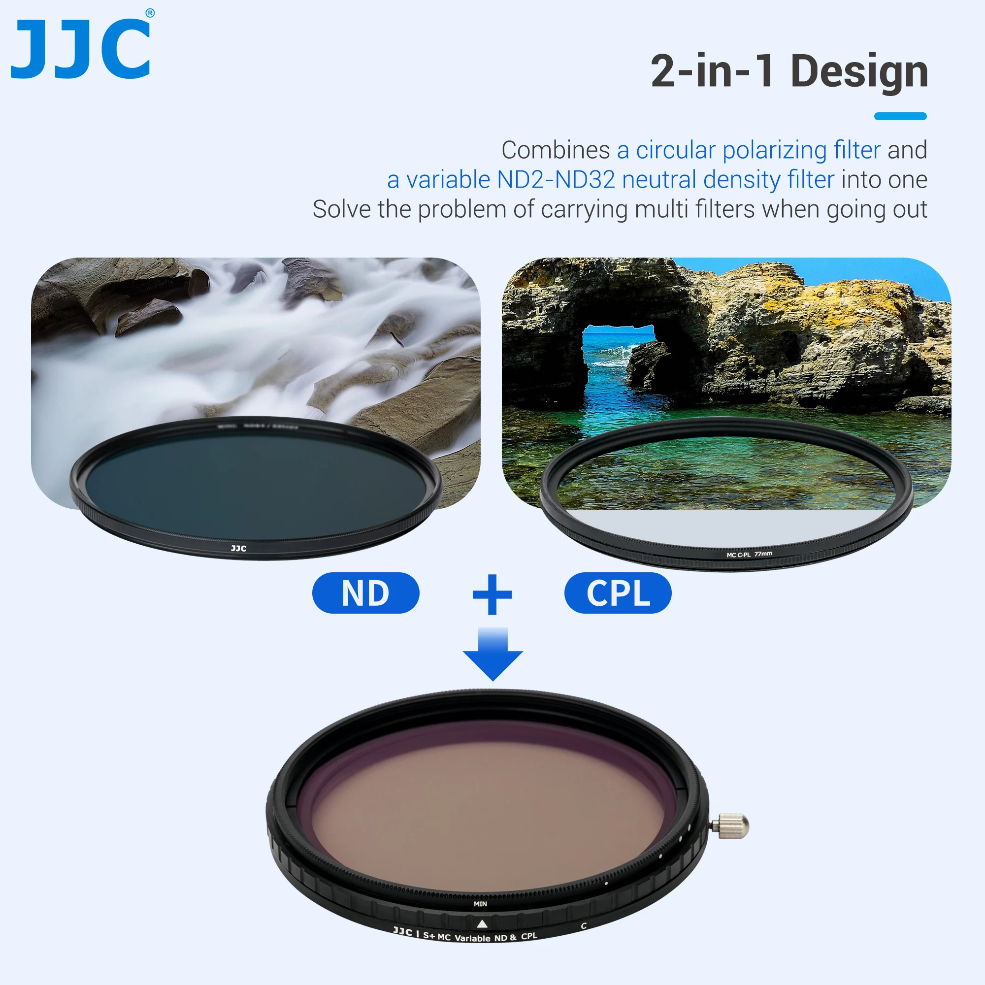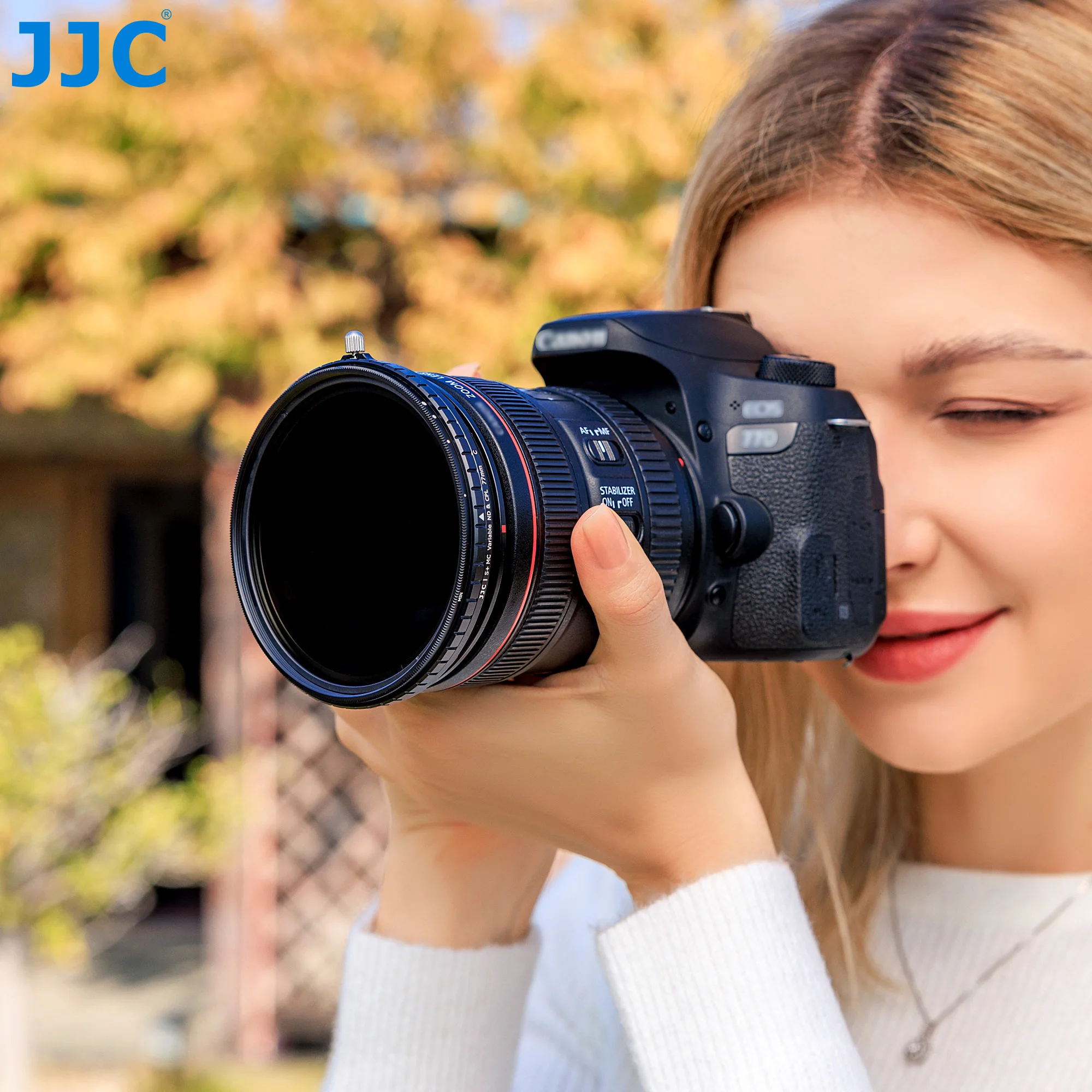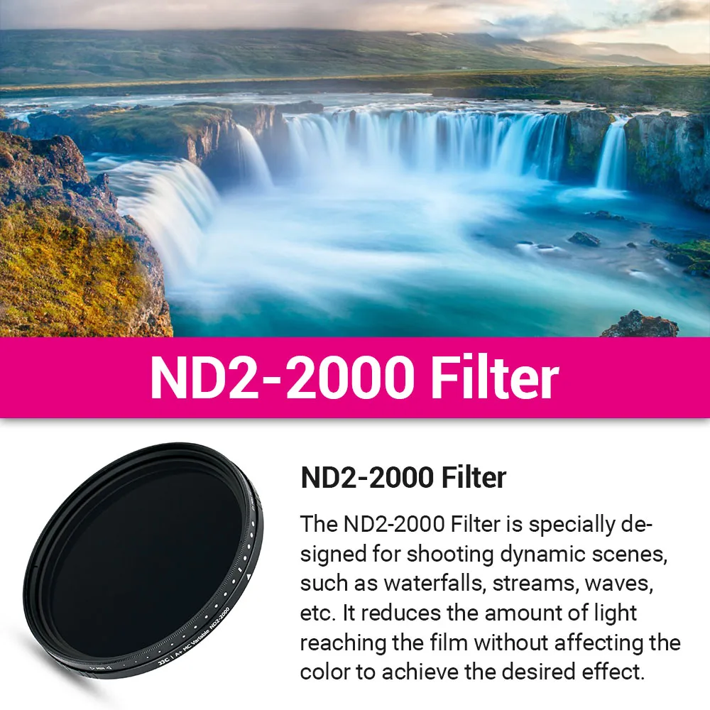 JJC F-NDV series Variable NeutraDensity Filter is suitable for shootingdynamic scenes such as waterfalls.streams, waves, etc.Neutral densitycan be adjusted form ND2 to ND400.