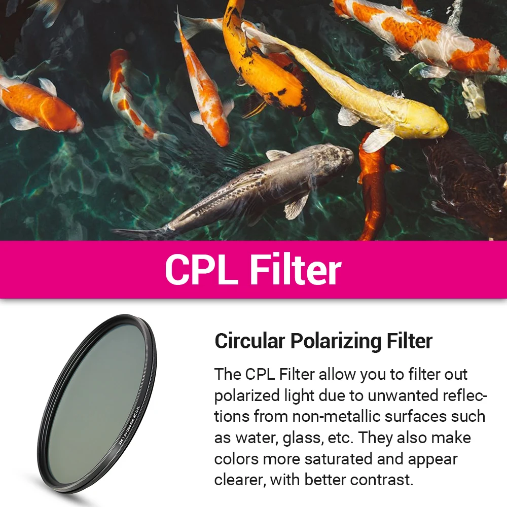 The CPL Filter allow you to filter outpolarized light due to unwanted reflections from non-metallic surfaces suchas water, glass, etc.They also makecolors more saturated and appearclearer, with better contrast.