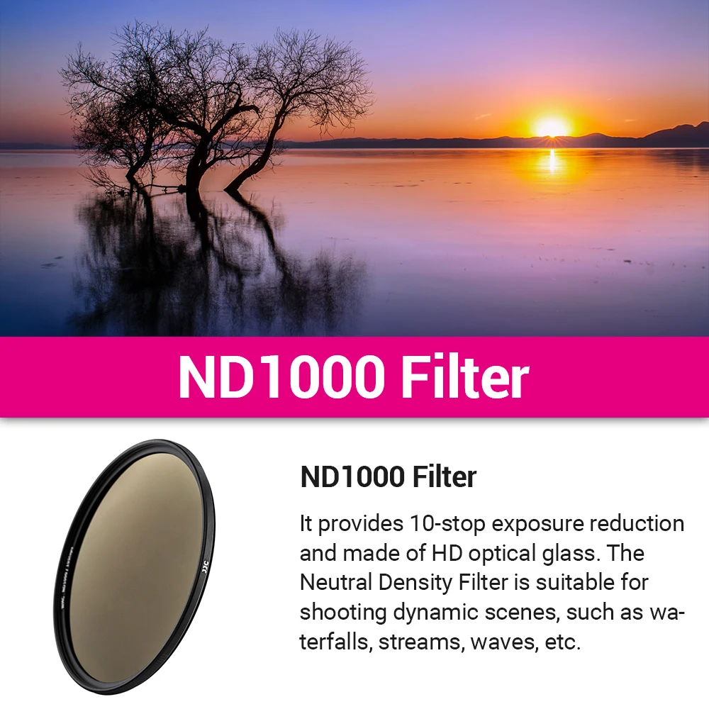 lt provides 10-stop exposure reductionand made of HD optical glass.TheNeutral Density Filter is suitable forshooting dynamic scenes, such as waterfalls, streams, waves, etc.