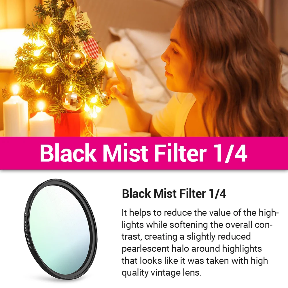 The filter softens highlight contrast, reduces glare and creates a soft-focuseffect, which makes your photos befull of mysterious, dream-like and ro-mantic color or allows you to carry ona creative shooting.