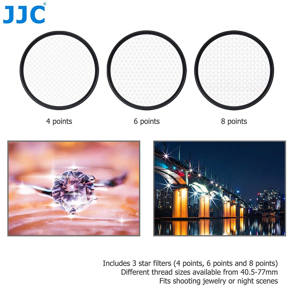 The Star Filter is made of high qualityoptical glass and etched with fine gridpattern on the surface. Depending onthe pattern, point light sources and objects with strong reflections createmulti-beam stars.