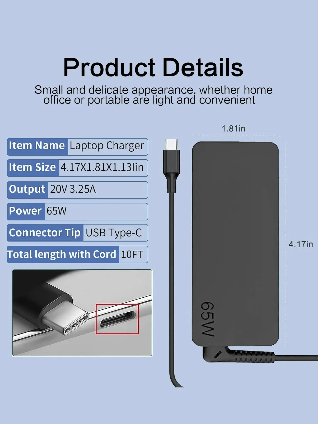 Зарядное устройство для ноутбука USB C 65 Вт. Вход: 100-240 В ~ 1,6 А, 50-60 Гц Выход: 110-240 В, 50 ~ 60 Гц. Выход: 20 В, 3,25 А, 65 Вт. (Также подходит для 45 Вт), также замена для Dell Hp Lenovo Acer Razer Blade Stealth Samsung Chromebook MacBook Asus Быстрая зарядка Тип C Тонкий адаптер питания для путешествий