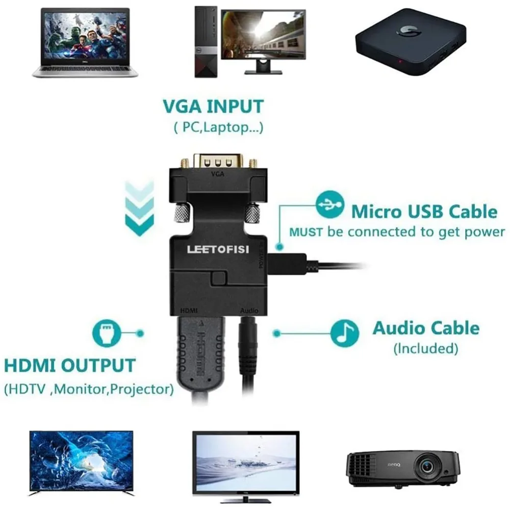 1.Портативный адаптер/конвертер VGA-to-HDMI. Легко Подключите старый Стильный компьютер/ноутбук с выходом VGA к телевизору, монитору или проектору с входом HDMI для потоковой передачи видео, игр или обмена контентом.