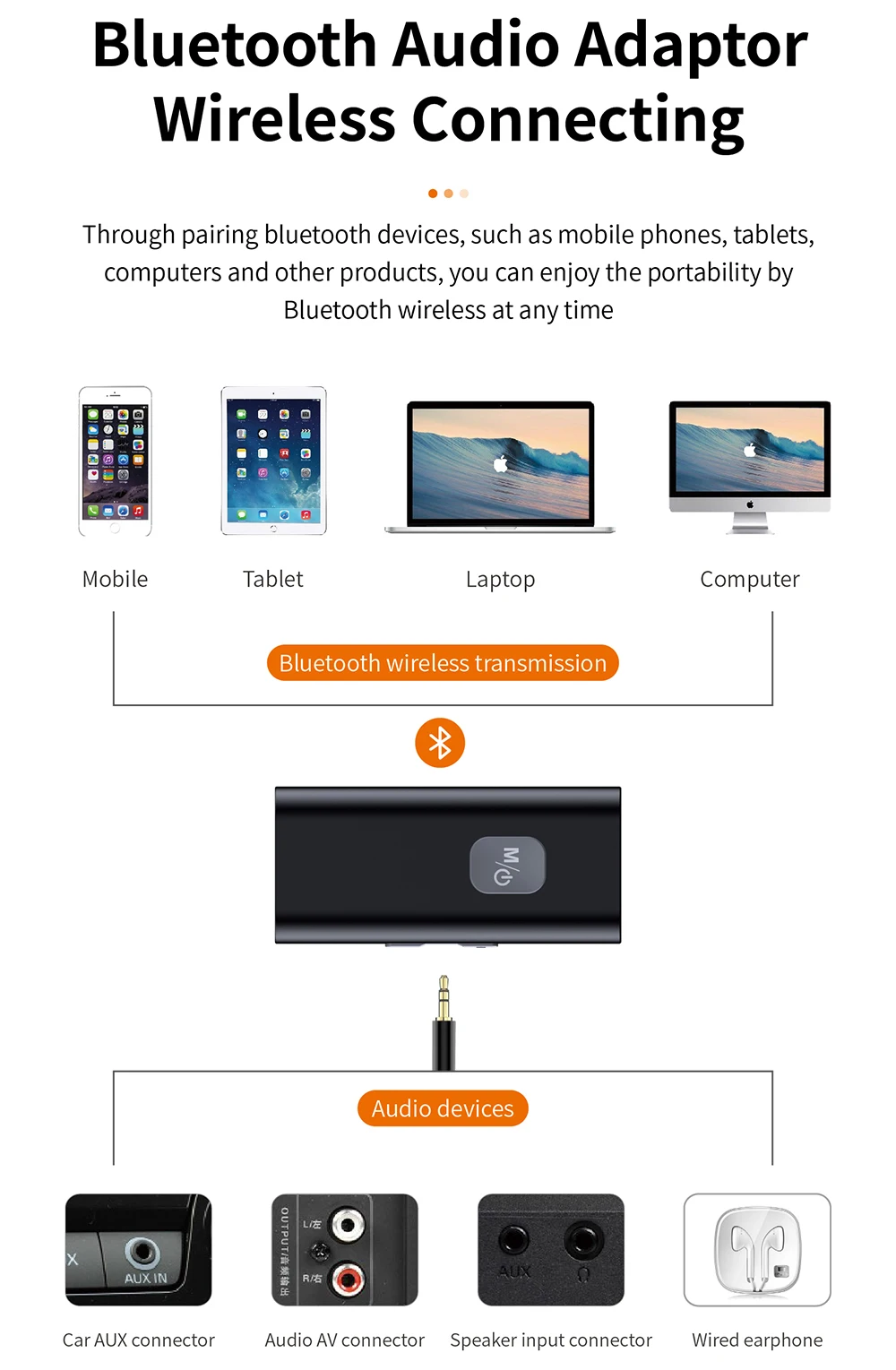 • Множественная Совместимость: он может работать с проводными наушниками и наушниками для идеальной громкой связи. Или, при использовании в автомобиле, он может работать через автомобиль и передавать музыку с телефона на автомобильную стереосистему. Конечно, вы можете заставить его работать со старым динамиком, планшетом, ноутбуком и другими устройствами.