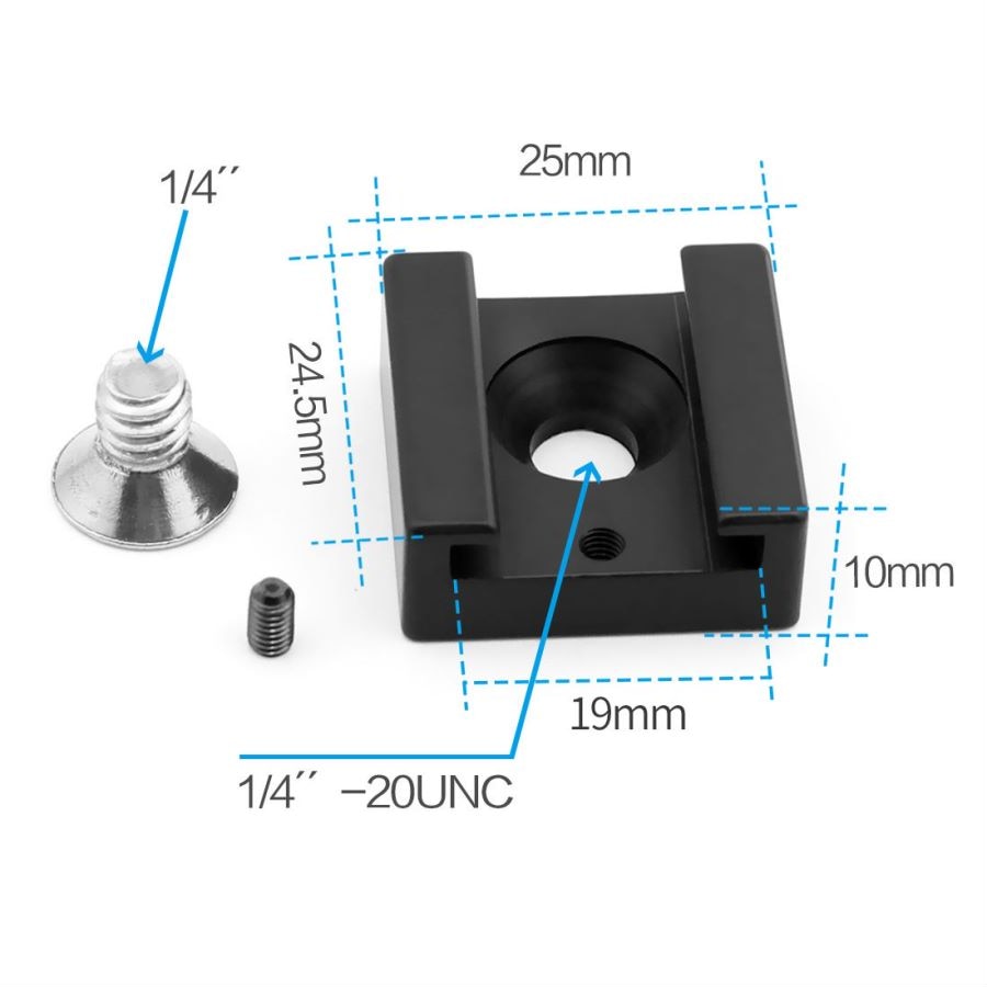 The Cold Hot Shoe Mount is made of aluminium. Comes with a 1/4" screw, you can mount it onto any 1/4-20 threaded hole,such as Blackmagic Cinema Camera, Pocket cinema camera,DSLR rig/cage/cheese plate. the Cold Hot Shoe Mount is perfect for you to attach video light on Blackmagic Cinema Camera or Pocket cinema camera.