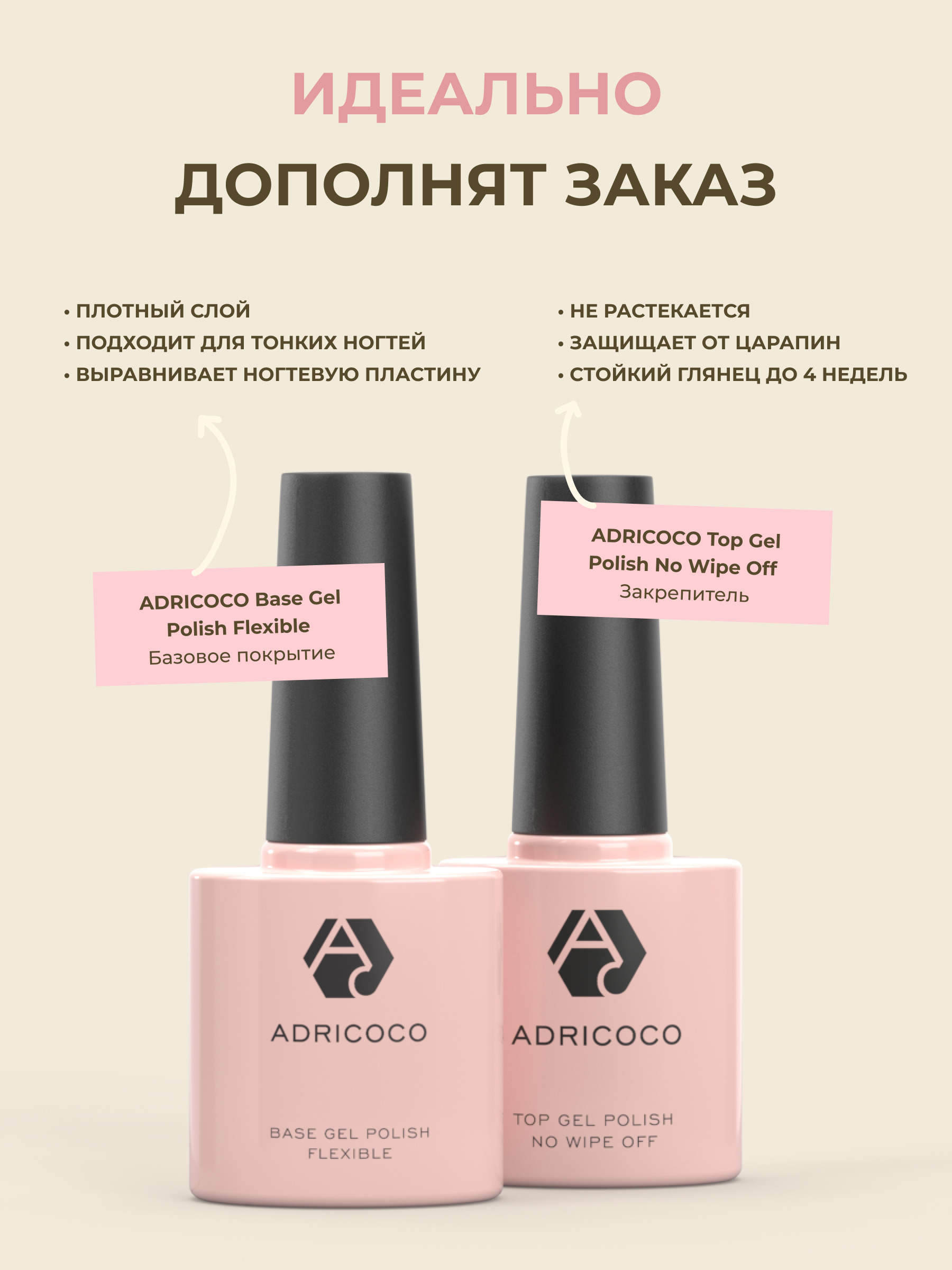 Шилак или шеллак для ногтей - так гель лаки называли раньше, а сегодня этими технологиями пользуются не только профессионалы, но и все желающие в домашних условиях. Для полимеризации этого гель лака обязательно наличие уф-лампы (UV LED). Для идеального маникюра применяется каучуковая база ADRICOCO. В ассортименте ADRICOCO есть цвета на любой вкус: гель лаки для ногтей с блестками, укрепление ногтей, гельлак светоотражающий, камуфлирующий, неоновый, кошачий глаз, блестящий, серый, черный, белый, желтый, красный, синий, зеленый, бежевый, молочный, бордовый, голубой, розовый, оранжевый, хаки, оливковый. В процессе нанесения рекомендуем использовать матовый или глянцевый топ от ADRICOCO! А если финишное (верхнее) покрытие вы завершите топом поталь серебро или золото от ADRICOCO, то получите особенный результат.