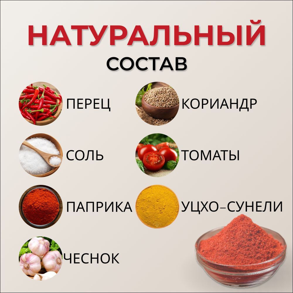 Соль, кориандр, перец красный, паприка, уцхо-сунели, чеснок, томаты, укроп, крахмал картофельный