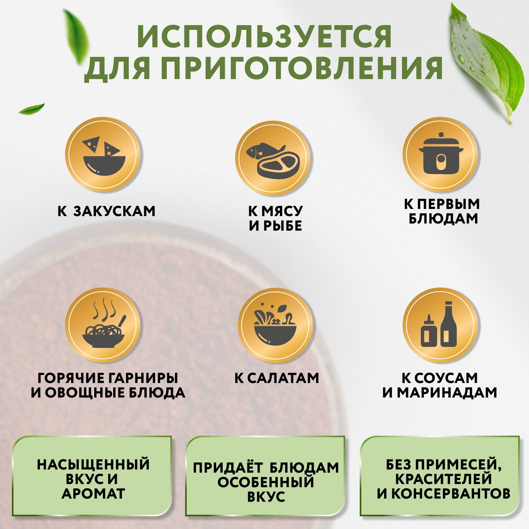 Назначение приправы: Для мясных блюд, Для соусов, Для супов, Для рыбы и морепродуктов, Для барбекю, Для блюд из картофеля, Для блюд на гриле, Для жаркого, Для копчения, Для курицы, Для лазаньи, Для овощей, Для паэльи, Для плова, Для птицы, Для риса, макарон и пиццы, Для свинины, Для тефтелей, Универсальная, Для украшения блюд