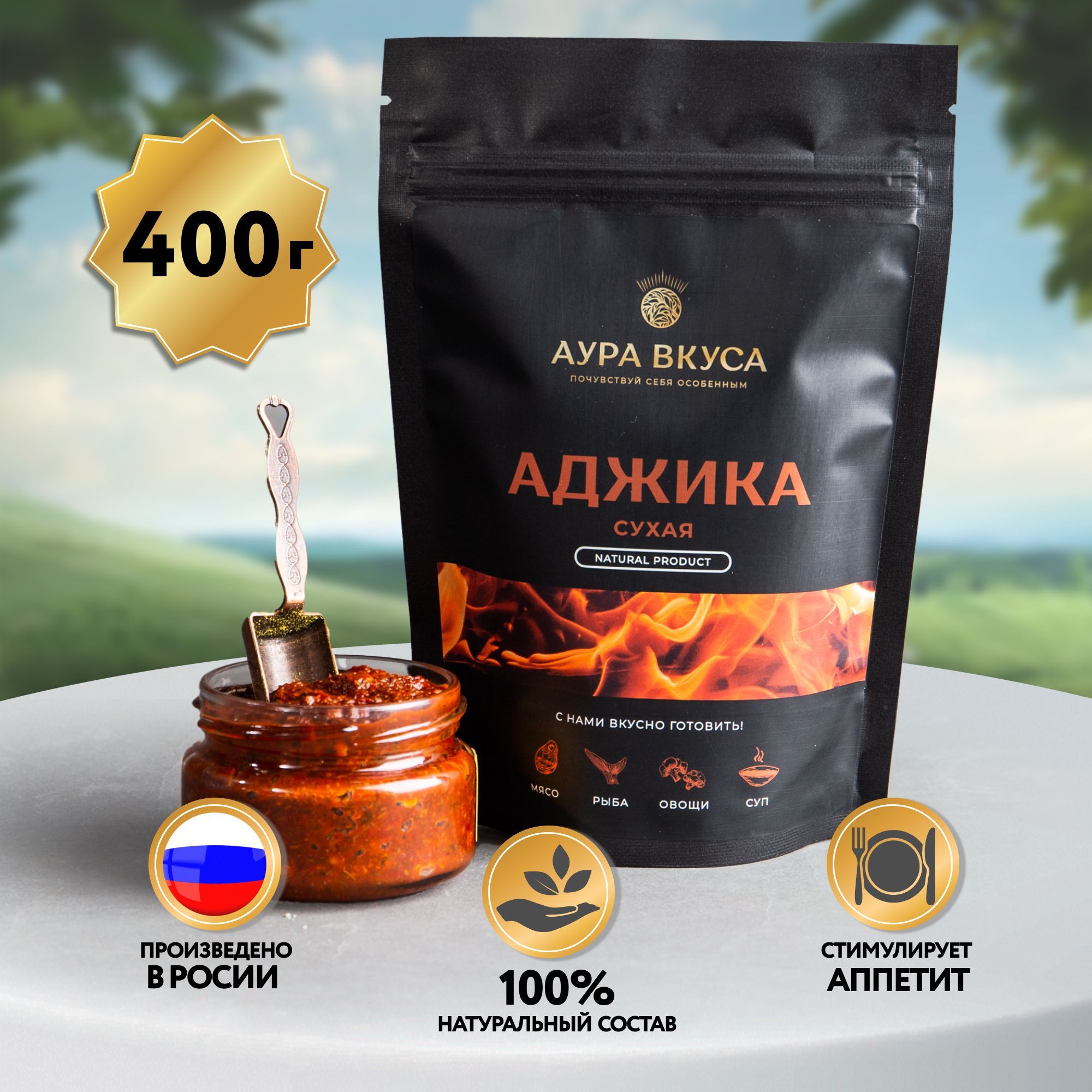 Аджика Острая Сухая Красная 400 г. Аура Вкуса. Универсальная приправа, специя для шашлыка, рыбы, мяса.