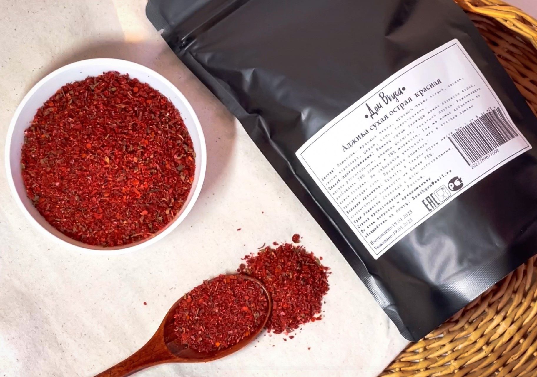 Пажитник, красный перец, красный перец острый, чеснок, семена кориандра, укроп, соль, хмели-сунели (состав базилик, петрушка, сельдерей, укроп, кориандр, лавровый лист, мята, чабрец, пажитник, иссоп, шафран , красный перец).