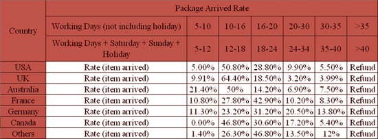 • Время доставки зависит от работы транспортной компании, таможни и почты пункта назначения, а также от других факторов. Большинство посылок может быть получено через 20 рабочих дней (4 недели). Смотрите ниже информацию о времени доставки и количественных данных: