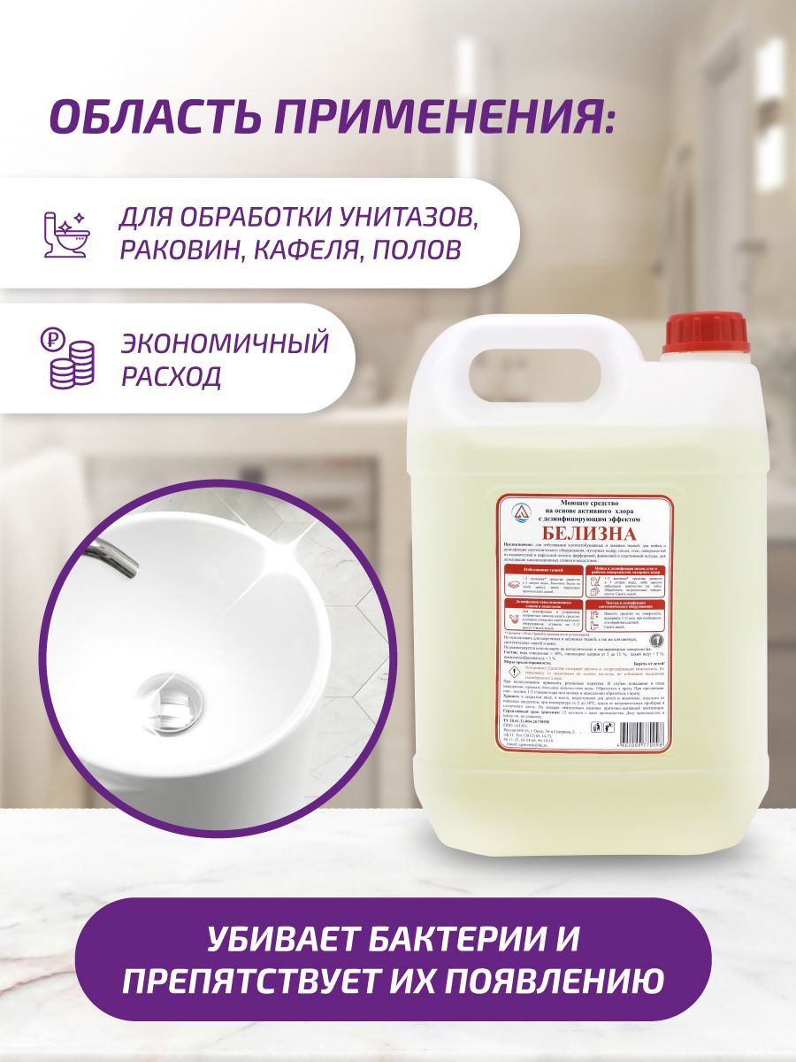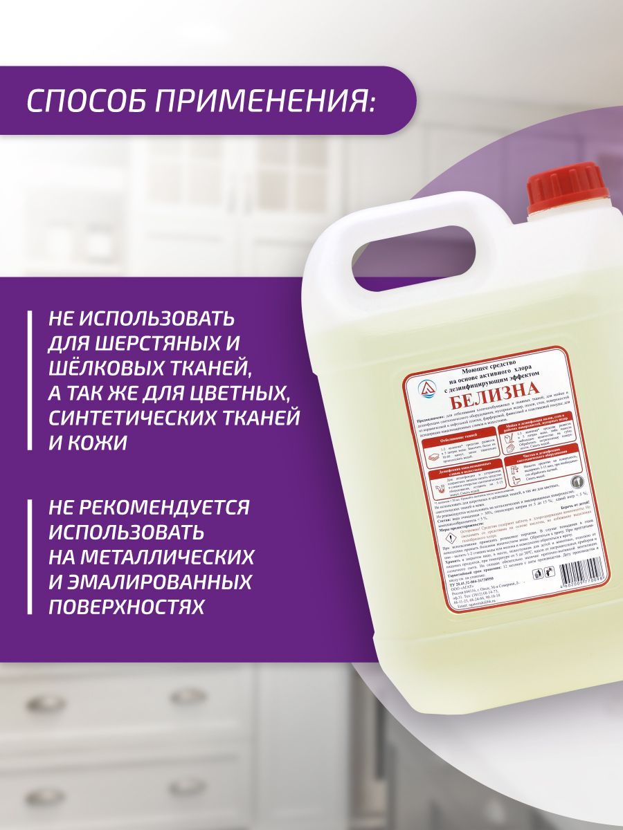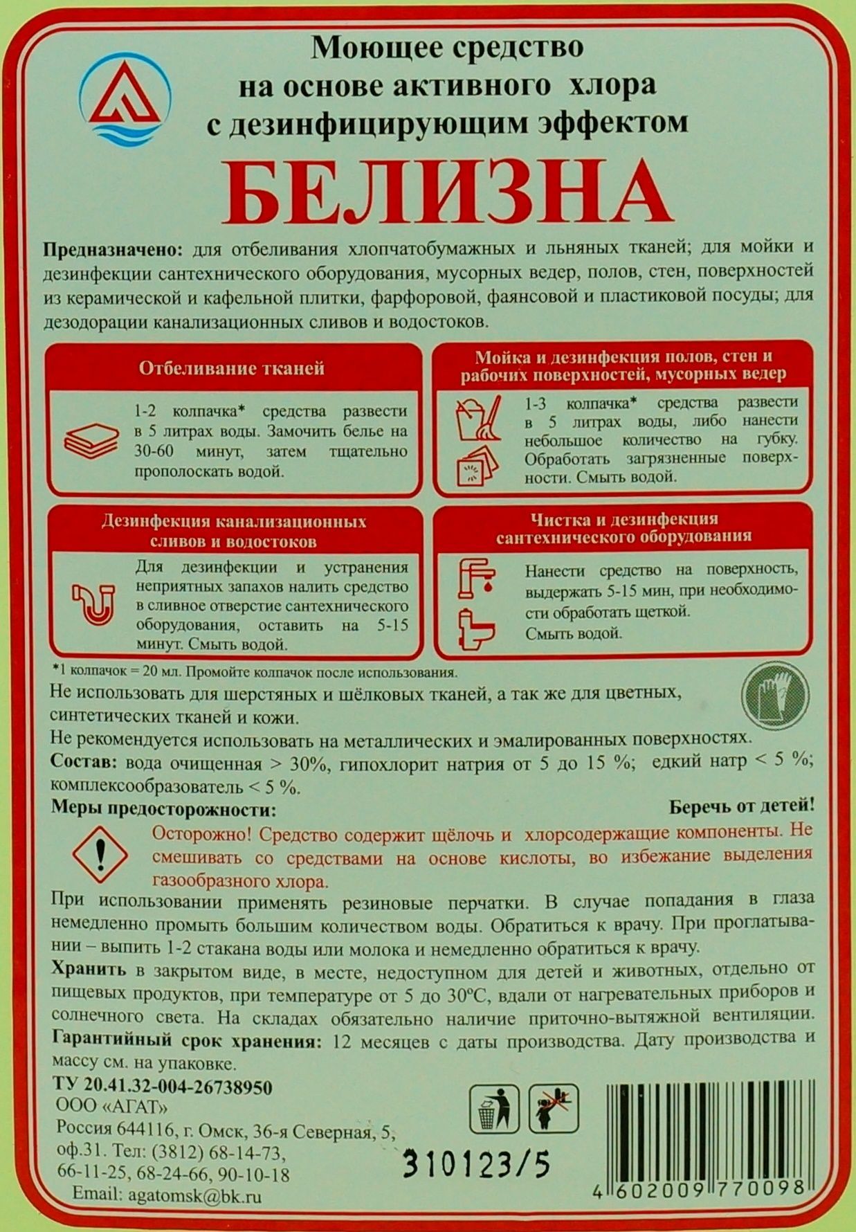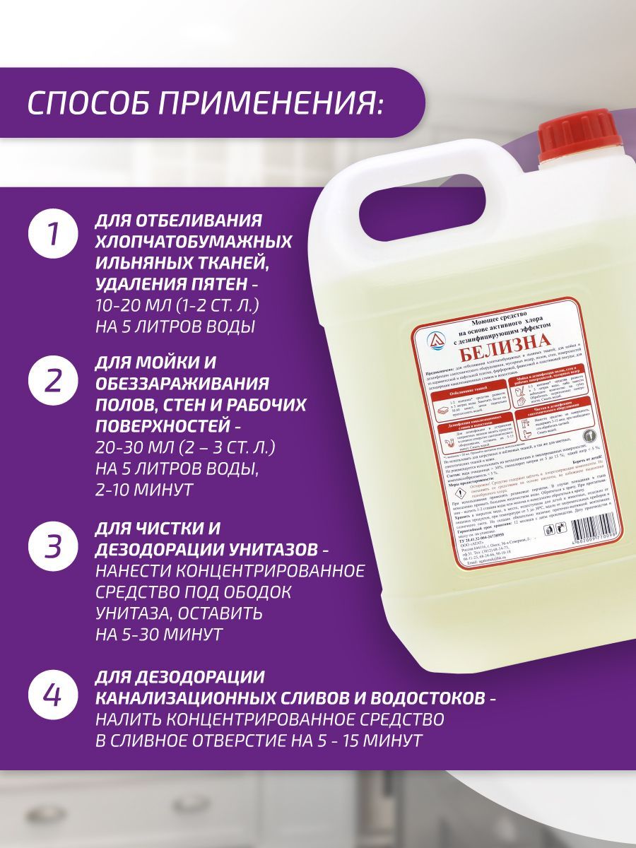 Описание: Белизна — многофункциональное средство. Его можно использовать, как отбеливатель для белья, отбеливатель для пластика, а также для мойки и дезинфекции сантехнического оборудования, мусорных ведер, полов, стен, поверхностей из керамической и кафельной плитки, фарфоровой, фаянсовой и пластиковой посуды. Средство для отбеливания также можно использовать для дезодорации канализационных сливов и водостоков. Отбеливатель выводит самые глубокие и старые пятна с одежды из хлопка и льна. Белизна не разрушает структуру ткани, сохраняя первоначальную форму и размер. Отбеливатели для белья полностью безопасны для человека при соблюдении инструкции на упаковке. Белизну можно использовать для бытовой влажной уборки. 5л Белизны хватит надолго, так как при мойке требуется малое количество средства. Белизна эффективно удаляет загрязнения и пыль, придавая поверхностям легкий блеск и свежесть. После каждого использования белизну необходимо тщательно смывать. Белизна безопасна для маленьких детей и домашних животных при соблюдении инструкции (см. на упаковке).