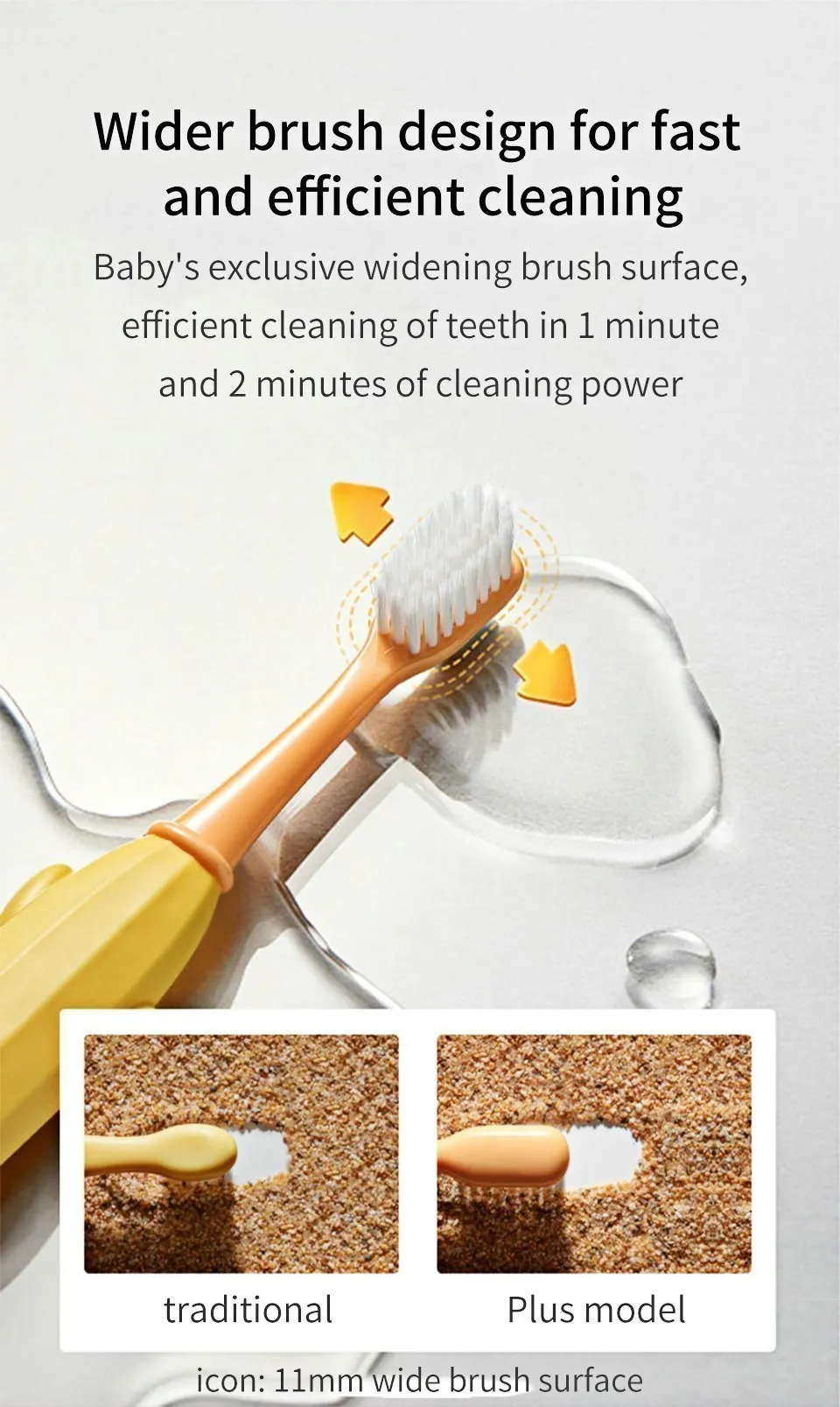 Эксклюзивная расширяющаяся поверхность щетки для ребенка, эффективная Очистка зубов за 1 минуту и 2 минуты чистящей мощности