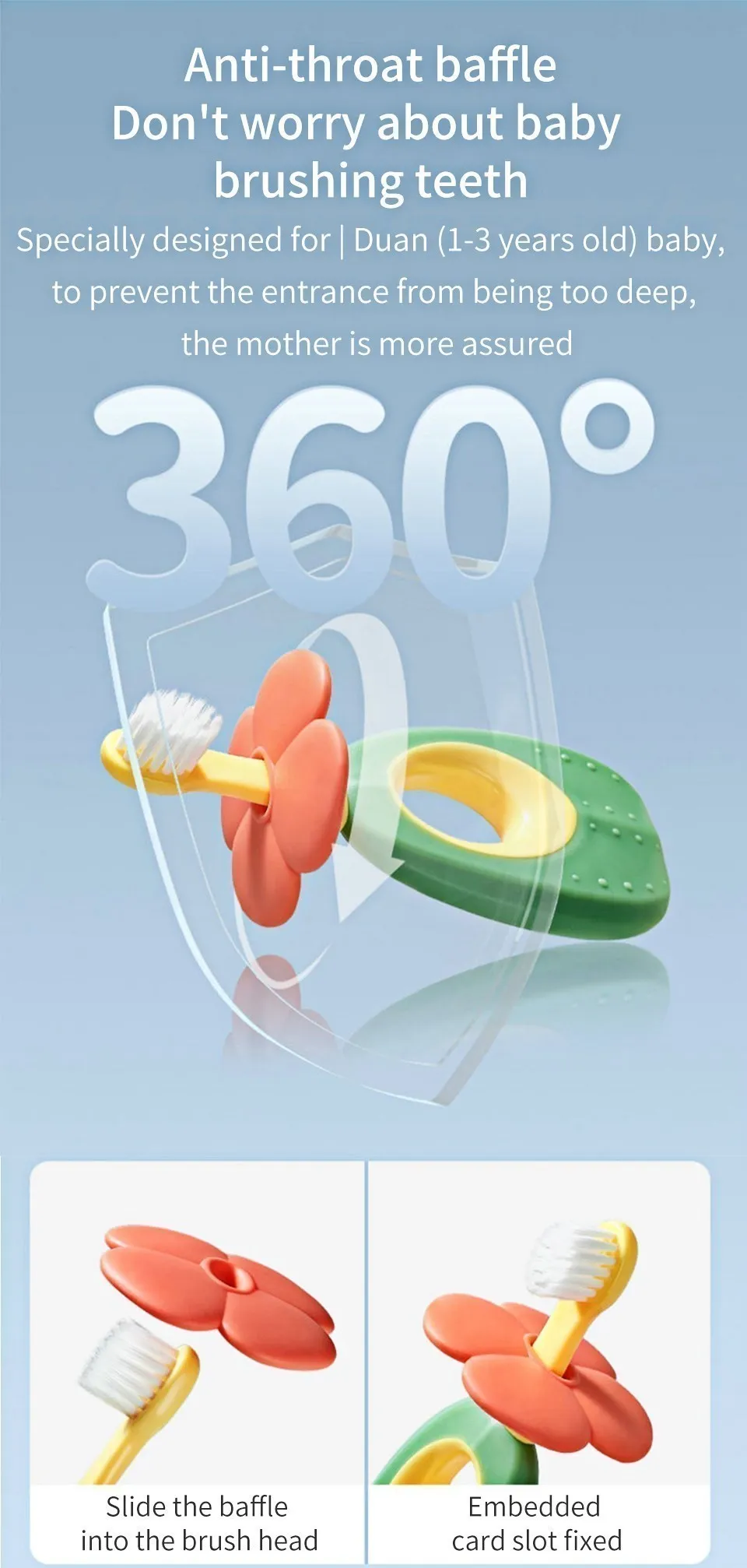 Маленькая головка щетки, подходит для маленького рта ребенка, гибкая и глубокая чистка между зубами, легко удаляет все виды остатков пищи