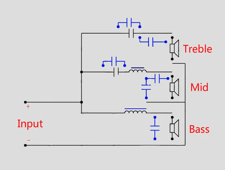 The divider is suitable for a treble, mid and bass speaker. The speaker is suitable for 4-8 ohm impedance.