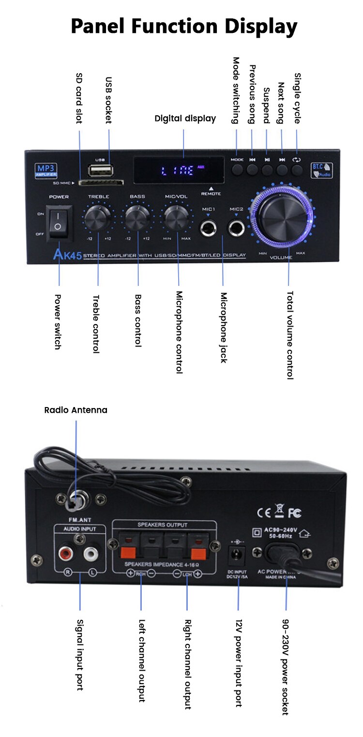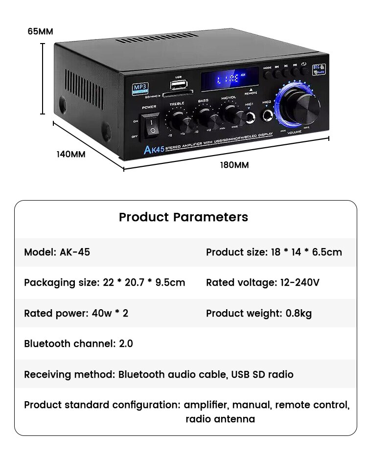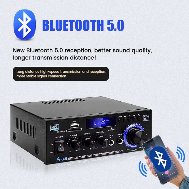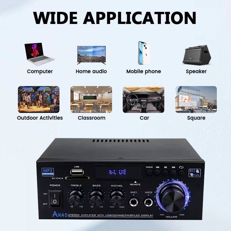 AK-45 HiFi стерео аудио усилитель FM USB MP3-канал 2,0 Звуковая мощность пульт дистанционного управления Поддержка 220 В для домашних автомобильных динамиков 40 Вт * 2