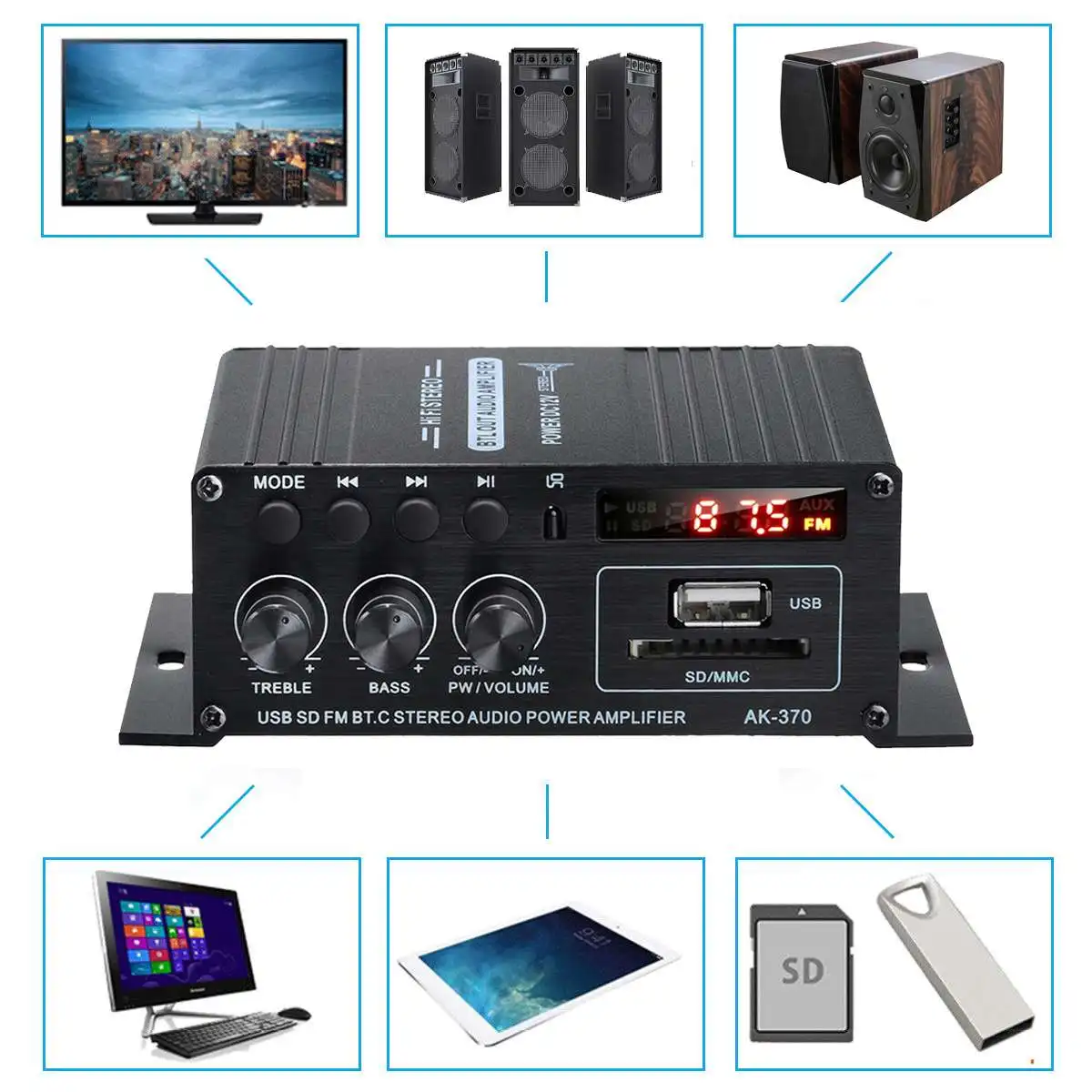 -Подходит для SD-карты, U-диска, входа AUX, воспроизведения в формате MP3, поддержки беспроводного подключения Bluetooth.