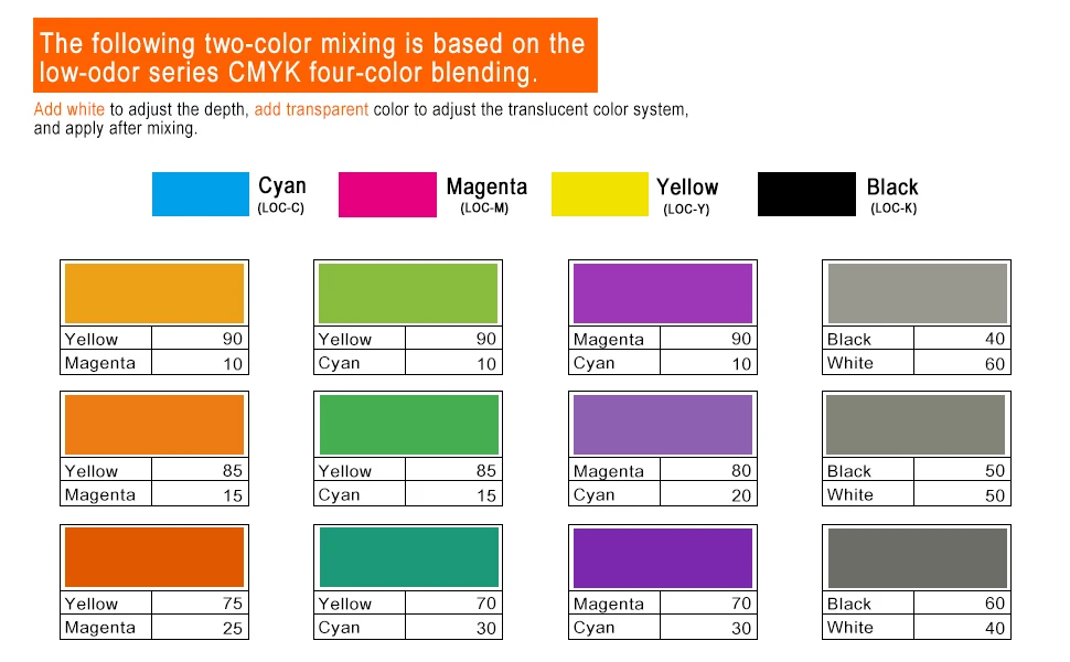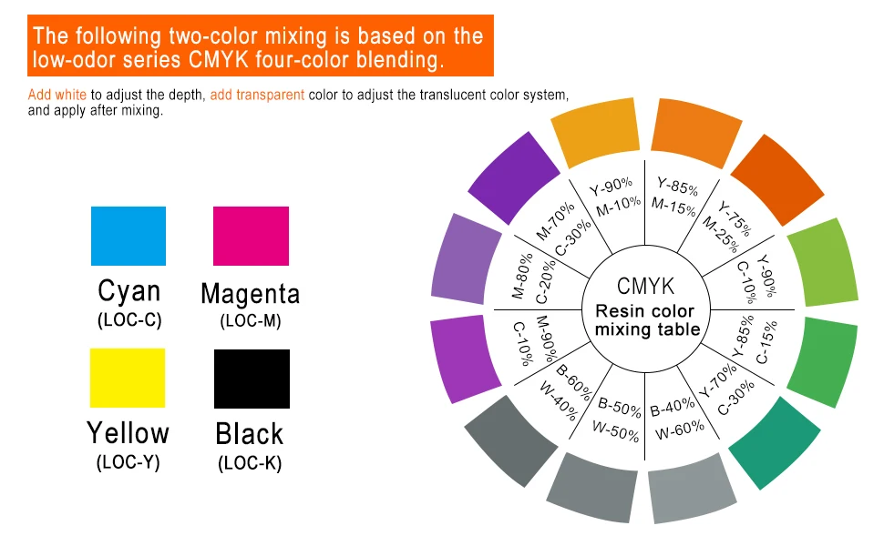-Доступно смешивание цветов-Еще одна большая особенность смолы с низким запахом-смешивание цветов. На основе приведенной таблицы CMYK 4 новых цвета могут быть созданы с 2 основными цветами, например, 90% желтого и 10% пурпурного создают оранжевый, белый можно добавить, чтобы получить легче, прозрачный может быть добавлен для регулировки прозрачности, нет необходимости менять время печати, и поверхность также отличная.