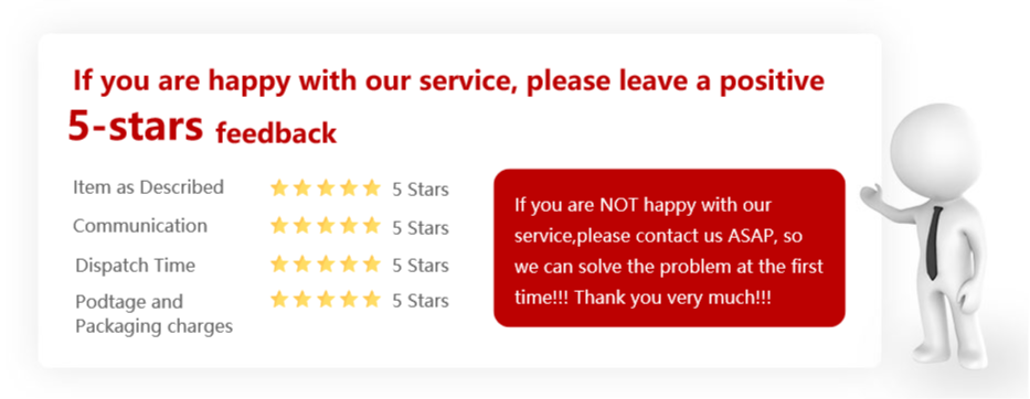 5. Пожалуйста, напишите нам, прежде чем оставлять отрицательный отзыв или открывать спор на сайте, потому что мы всегда стараемся обслуживать наших клиентов, мы предоставим вам удовлетворительное решение.