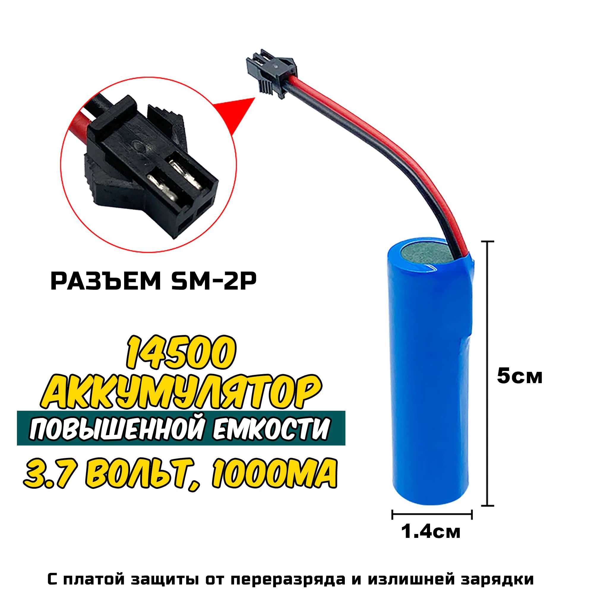 Аккумулятор 14500, 3.7 вольт, 1000mAh, с разъемом SM-2P, для игрушек, для радиоуправляемых машинок