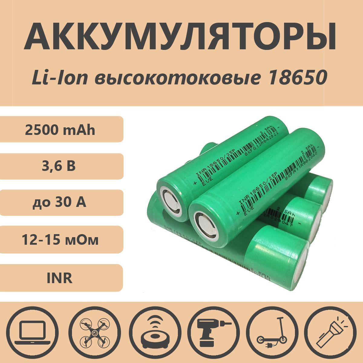Аккумуляторы предназначены для использования в вэйпах, машинках для стрижки волос, GPS-навигаторах, радиоуправляемых моделях, радиотелефонах, видеокамерах, фотокамерах, фонарях, бытовых электроприборах, для восстановления съемных аккумуляторов ноутбуков, электровелосипедов, электросамокатов, шуруповертов и другого электроинструмента, работающего на Li-Ion аккумуляторах.