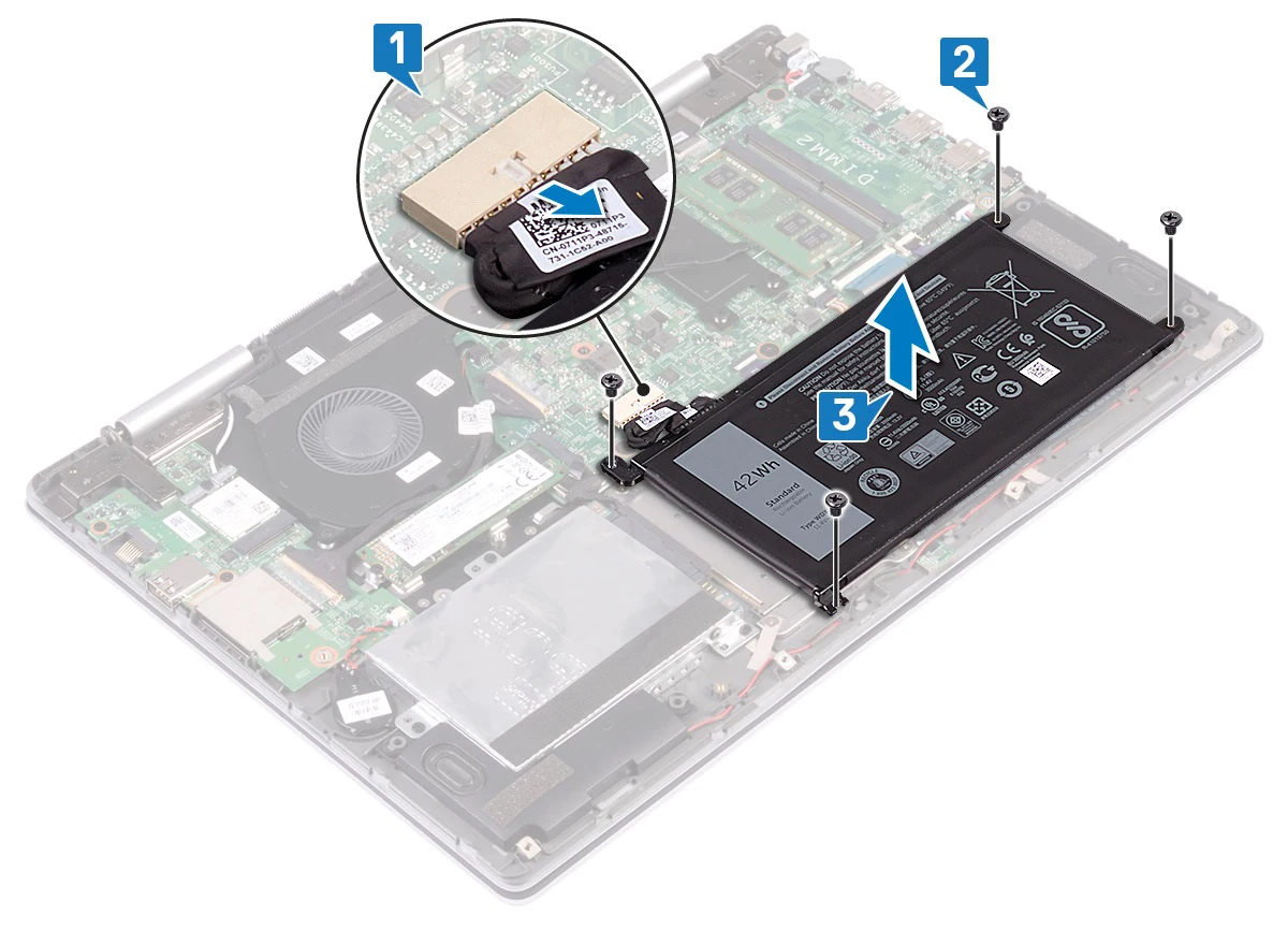 1. С помощью кнопки pull отсоедините кабель аккумулятора от системной платы.