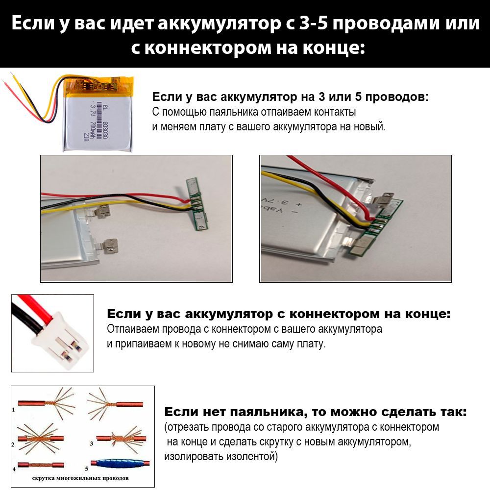 2️⃣ Если у вас 2 провода с коннектором 👉 откусить провода от вашего аккумулятора и припаять к нашему аккумулятору к плате, не переставляя плату.
