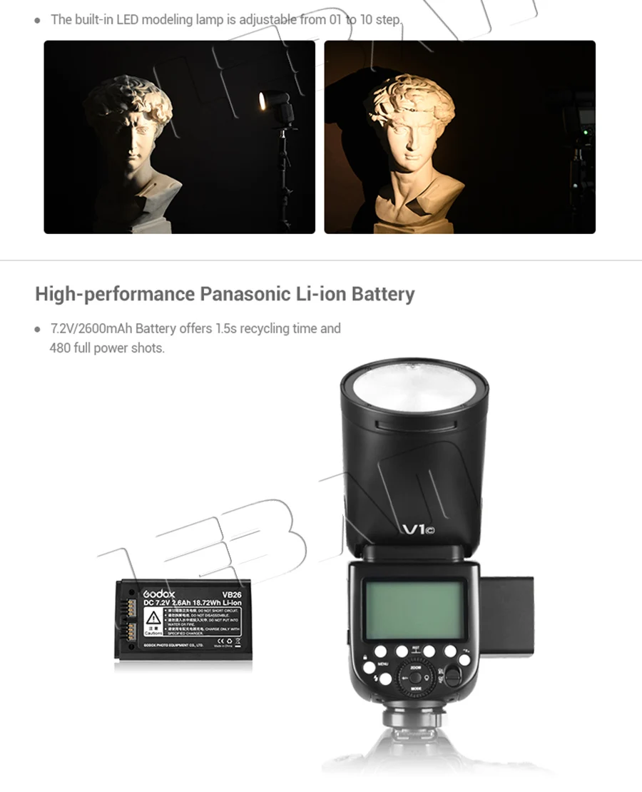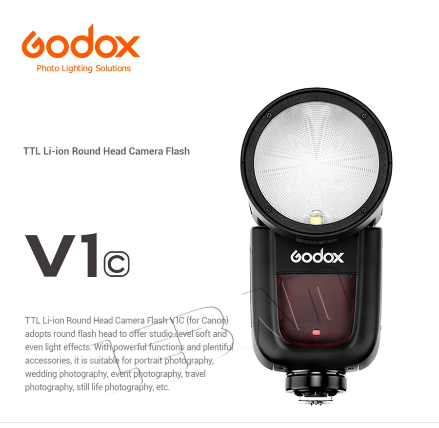 Godox V1 оснащен круглой головкой вспышки, чтобы предложить студийный мягкий и ровный светильник.