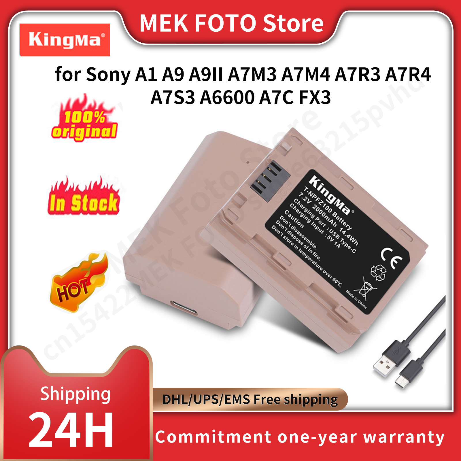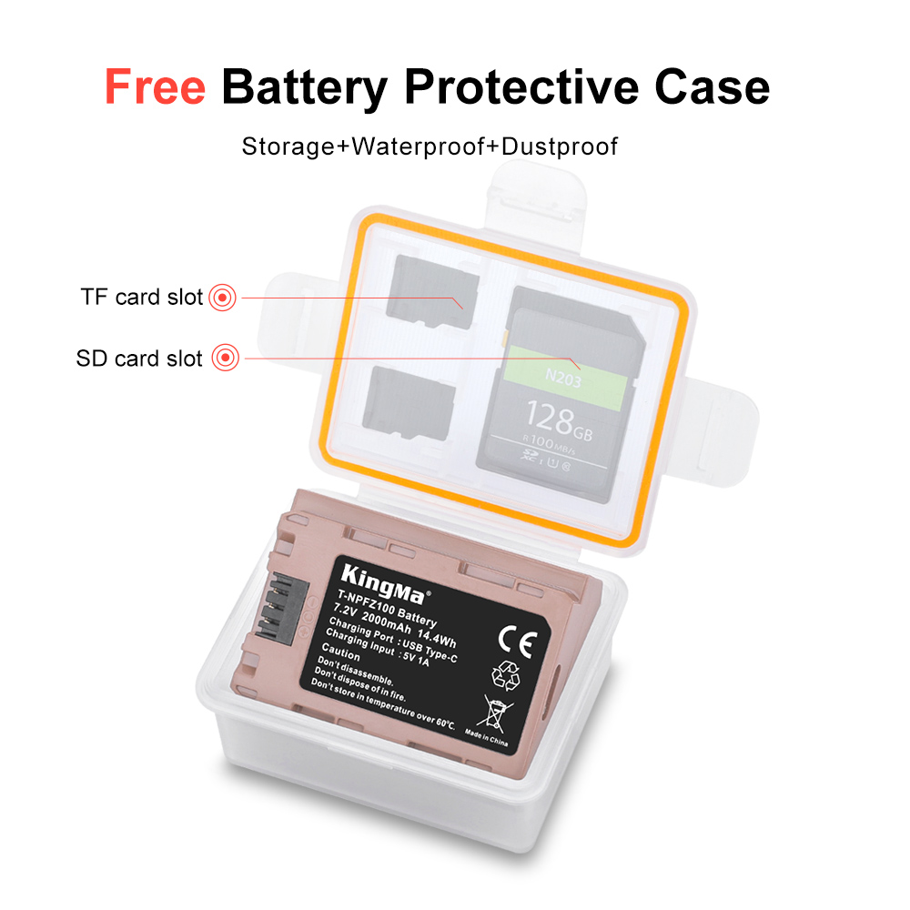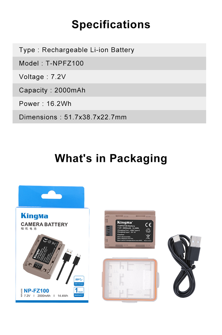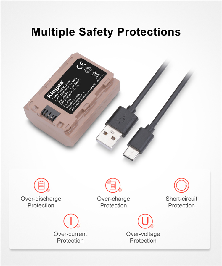 Аккумулятор KingMa NP-FZ100 2000 мАч с зарядным кабелем типа C для камер Sony A1, A9, A9II, A7M3, A7M4, A7R3, A7R4, A7S3, A6600, A7C, FX3