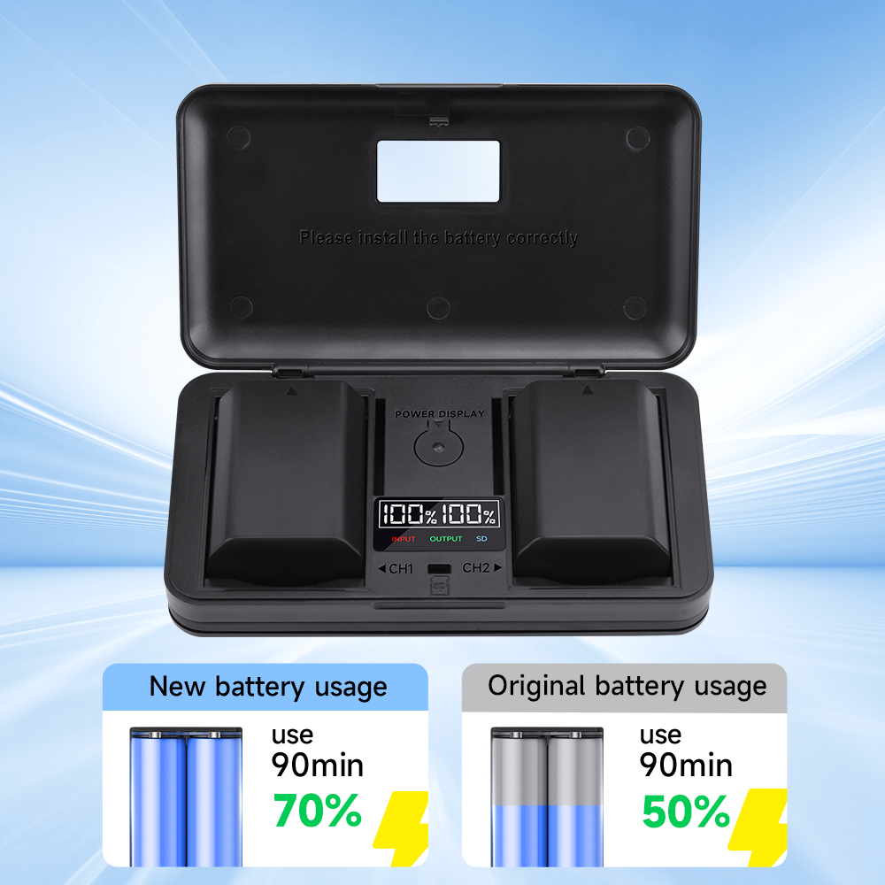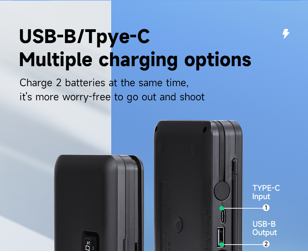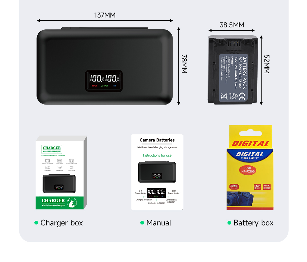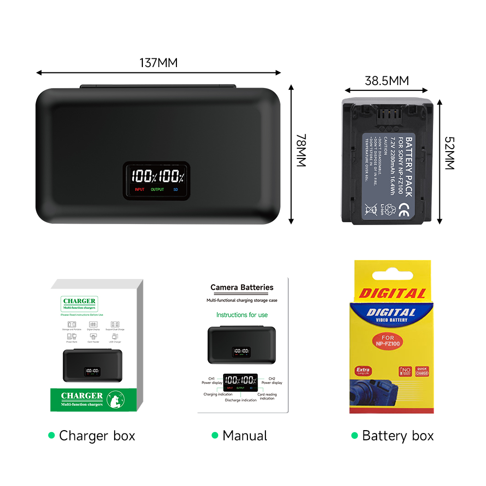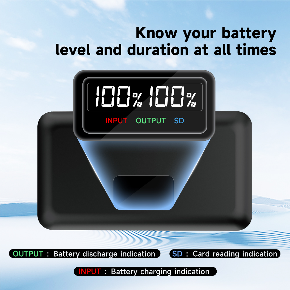 * 2,4-в-1 многофункциональное зарядное устройство: ЖК-зарядное устройство с двумя слотами + аккумуляторный ящик + устройство чтения SD-карт + внешний аккумулятор