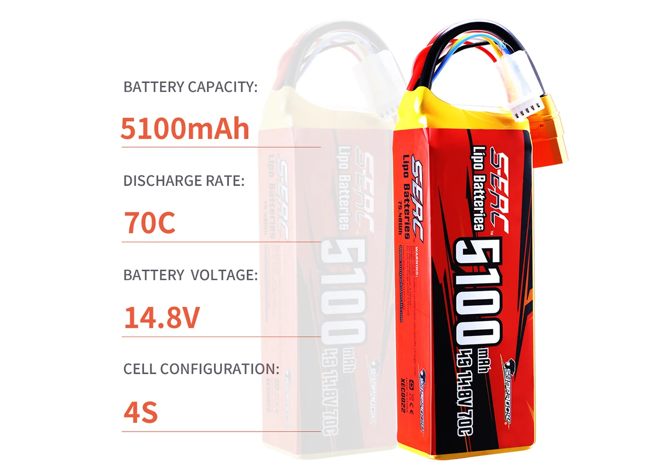 5100mAh-4S1P-14.8V-70C: 146*51*36 мм, 513 г, штепсельная вилка XT90