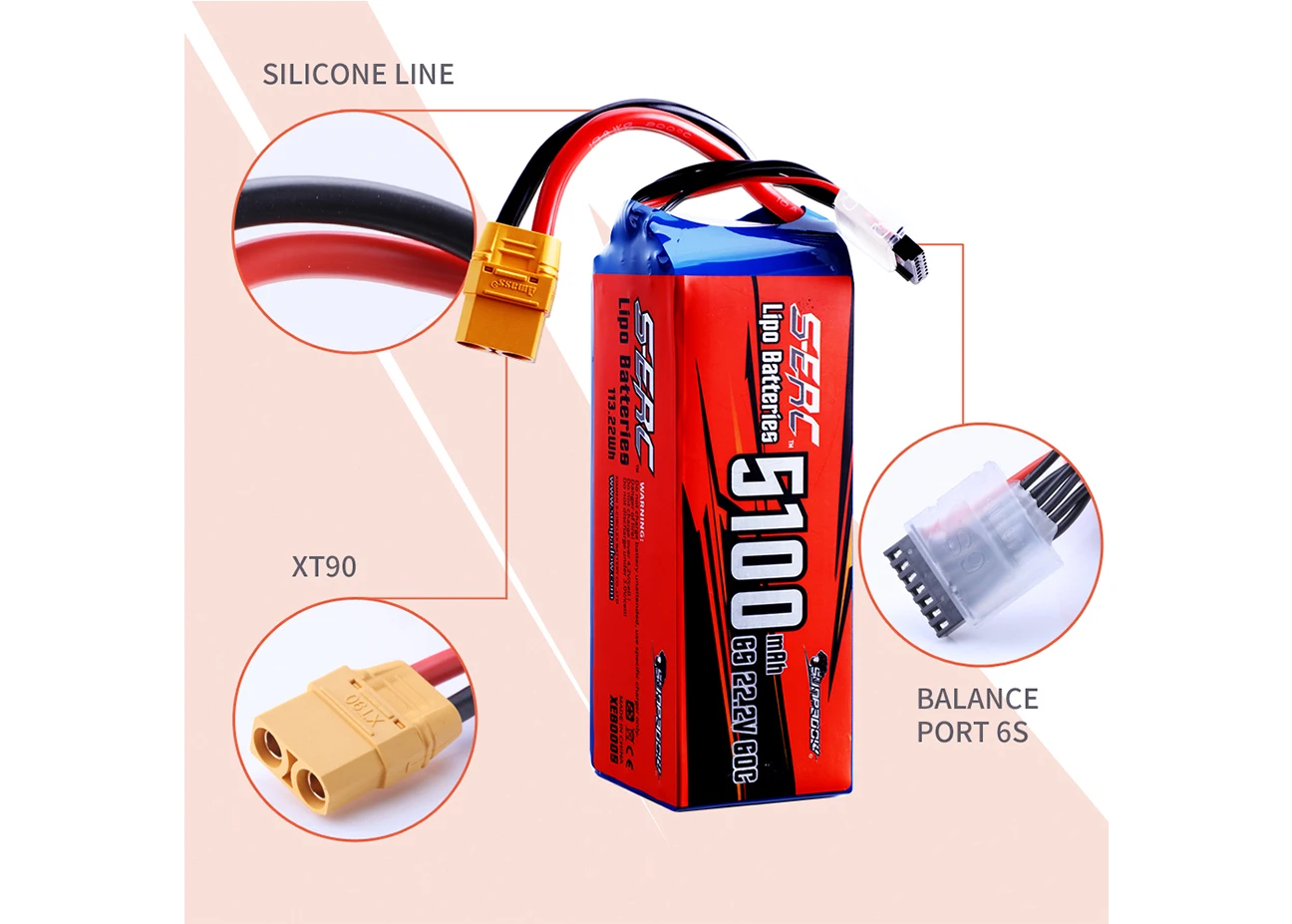 5100mAh-6S1P-22.2V-60C: 146*51*50 мм, 753 г, штепсельная вилка XT90
