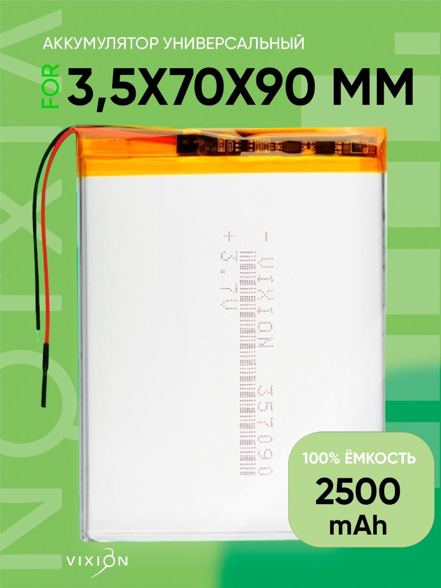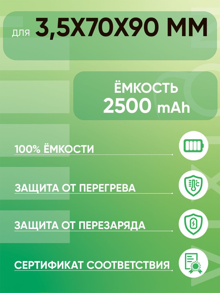 Описание: Универсальный Li-Pol аккумулятор (3,5x70x90 mm) позволит не беспокоиться о подзарядке устройства на протяжении длительного времени. ВНИМАНИЕ! Рекомендуем обратиться в специализированный сервисный центр, во избежание проблем, которые могут привести к неисправности батареи, при самостоятельной установке аккумулятора. Компактный источник энергии прост в эксплуатации, безопасен и долговечен. Для каждого аккумулятора Vixion отбираются лучшие компоненты. АКБ Vixion имеет качественные платы контроллеров, установленные для корректировки отдаваемого напряжения.