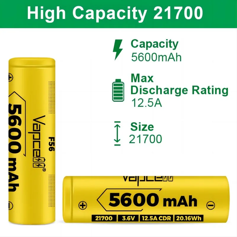 Максимальная емкость 21700 Vapcell INR 21700 аккумулятор 5600 мАч F56