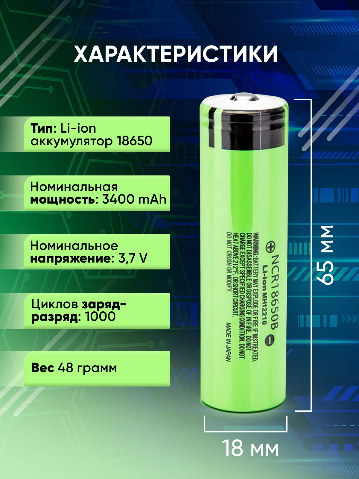 • Типоразмер 18650 - означает 18мм диаметр, 65мм высота батареи, а 0 указывает на круглую форму аккумулятора.