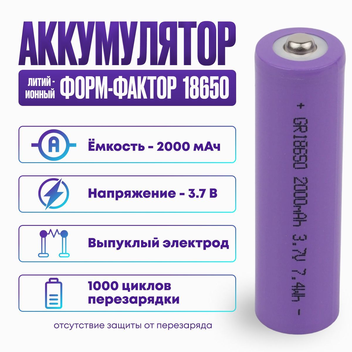 Аккумуляторная батарейка Li-ion 18650 2000 мАч 3.7 В, с выпуклым электродом для фонариков и бытовых приборов - 1 шт