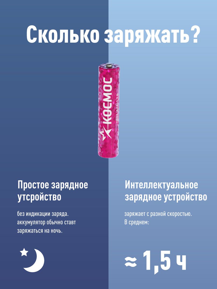 Описание: "Набор аккумуляторов космос NiMh, 600 mAh, тип ААА, 2 штуки Аккумуляторы "Космос" обладают высокой емкостью, отсутствием "эффекта памяти", возможностью быстрого заряда. Используются в цифровых фотокамерах, радиоуправляемых игрушках, и других устройствах с высоким энергопотреблением. Температура эксплуатации: 0-45"