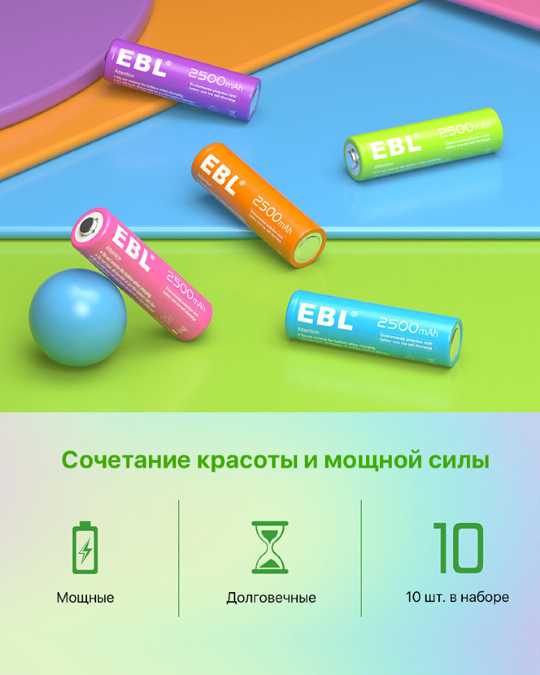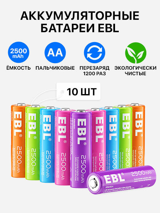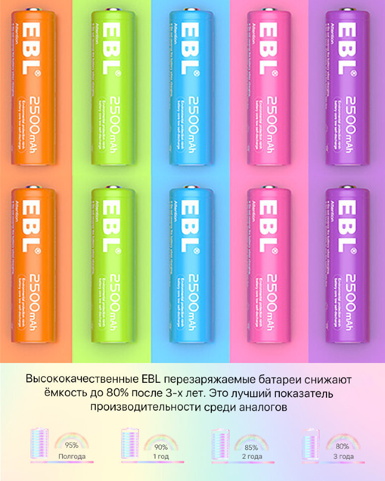 Температурный диапазон: -40°/+60°СТекстовое описание изображенияЗарядись радугой!EBL Rainbow - это перезаряжаемые батарейки с низким саморазрядом в ярком сочном дизайне. Элементов питания каждого цвета по две штуки, благодаря чему вы не запутаетесь какие батарейки следует зарядить, а какие уже готовы к работе! Весь комплект хранится в специальном кейсе, спасающий от потери и возможных поврежденийТекст при отключенной в браузере загрузке изображенийEco-FriendlyНикель - металлогидридные аккумуляторы более безопасны для окружающей среды, так как не содержат опасных элементов ртути, кадмия и свинцаТекст при отключенной в браузере загрузке изображений1200 перезарядок! Что?!?Да! Перезаряжаемые батарейки EBL работают на технологии ProCyco, увеличивающую общее количество перезарядок до 1200 раз! Особая конструкция с использованием передовых технологий позволила значительно повысить долговечность. За 3 года ёмкость снизится всего на 15%, что выгодно отличает их от аналогов