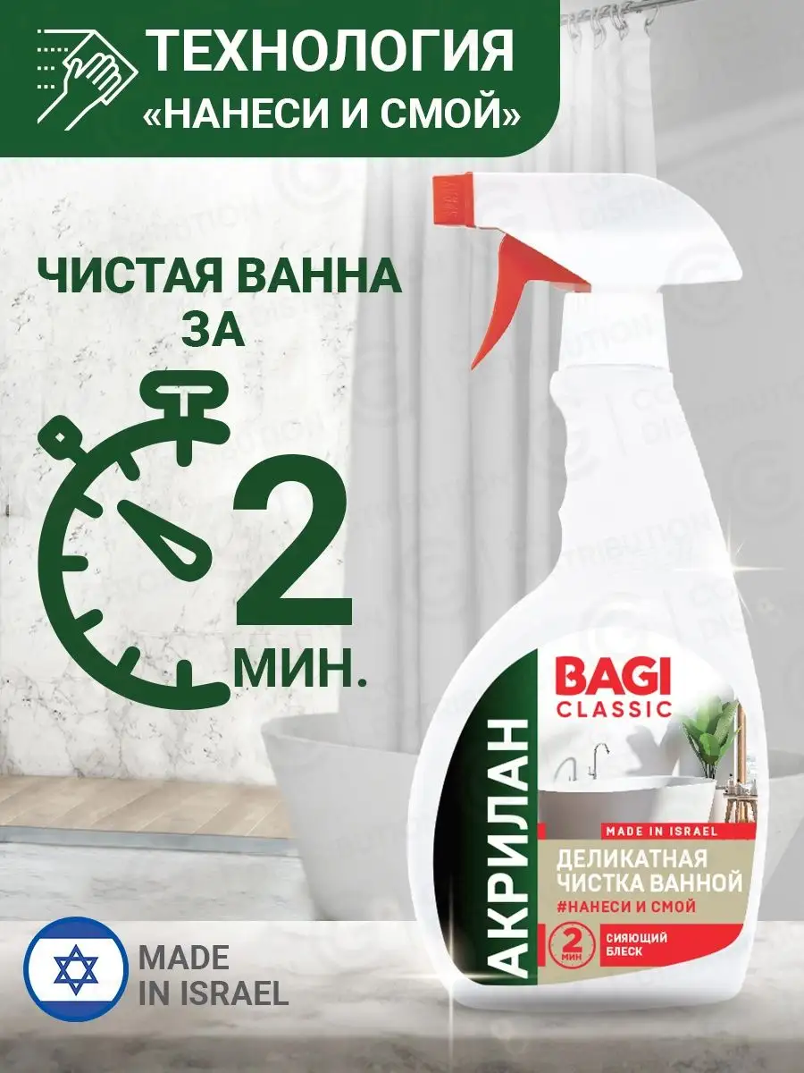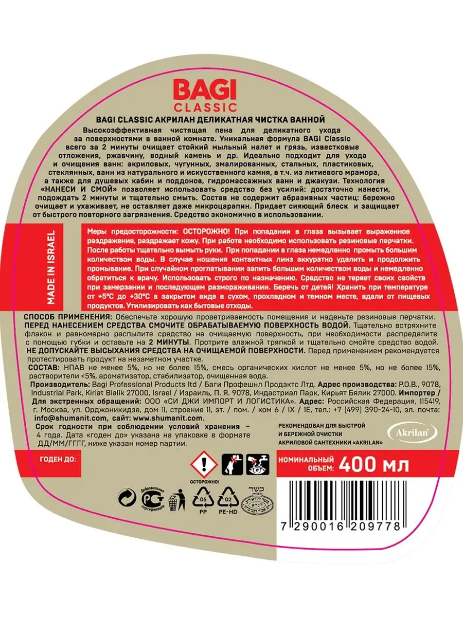 Описание: Новая линейка BAGI средства по уходу за домом BAGI CLASSIC. Запатентованные формулы и проверенный временем состав по приемлемой цене! Акрилан BAGI CLASSIC высокоэффективная чистящая пена для деликатного ухода за поверхностями в ванной комнате. Универсальное чистящее средство для ванн и туалета удаляет всего за 2 минуты очищает стойкий мыльный налет, грязь, от известкового налета и отложений, ржавчину, водный камень. Подходит для ухода и очищения ванн: акриловых; чугунных; эмалированных; стальных; пластиковых; стеклянных; ванн из натурального и искусственного камня, в том числе литиевого мрамора. Чистящее средство для мытья душевых кабин и поддонов, гидромассажных ванн и джакузи. В составе бытовой химии для дома, ванны и туалета присутствуют органические кислоты. Антиналет не содержит абразивных частиц: бережно очищает и ухаживает, не оставляет микроцарапин. Придает сияющий блеск. Экономично в использовании.