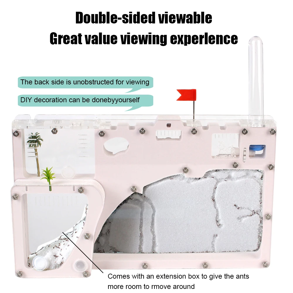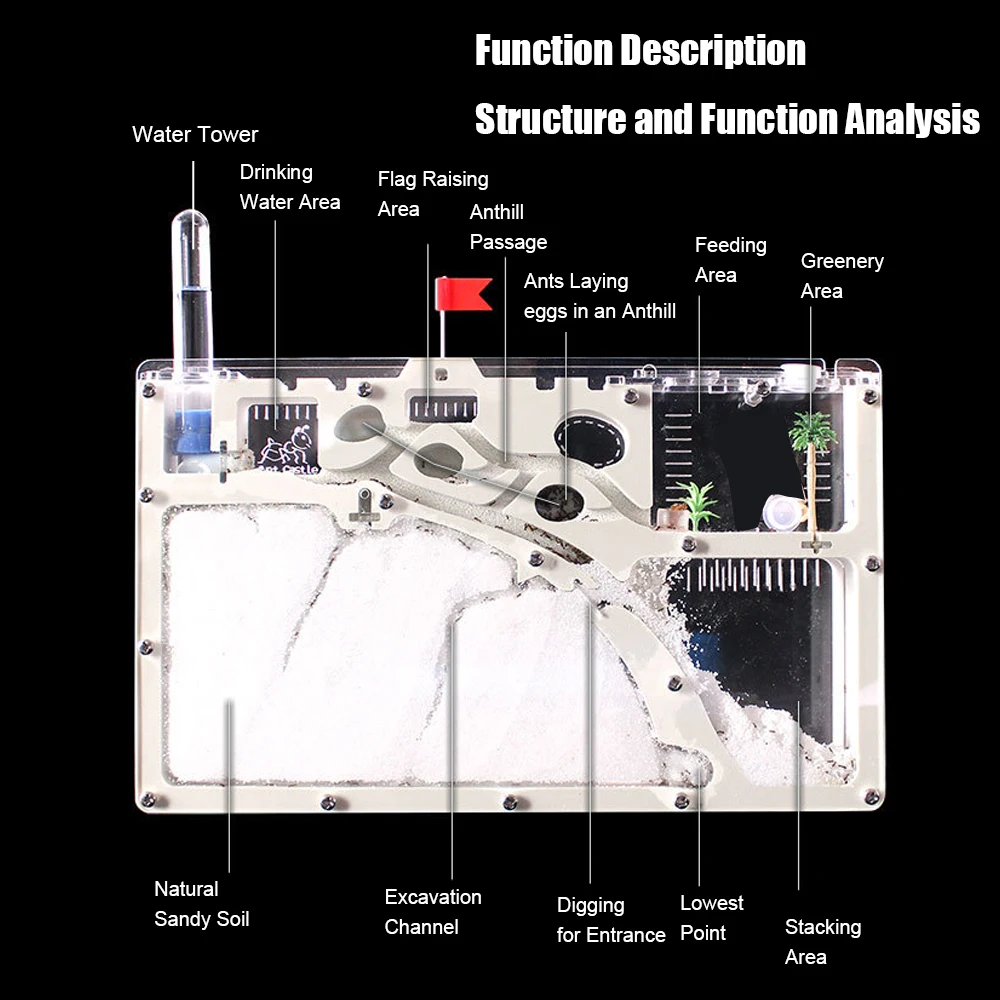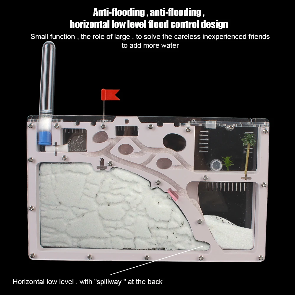 • Разработан как сообщество: муравьиная ферма оснащена несколькими жилыми помещениями. Зона водоснабжения, питаясь зона, зона размножения, зона отдыха (с 2 зелеными заводами), зона песка храня, рабочая зона, тоннели связи, ЕТК. Это в значительной степени обогатит опыт муравьев, которых вы собираетесь вставить. Кроме того, продолжительность жизни муравьев будет соответственно улучшена.